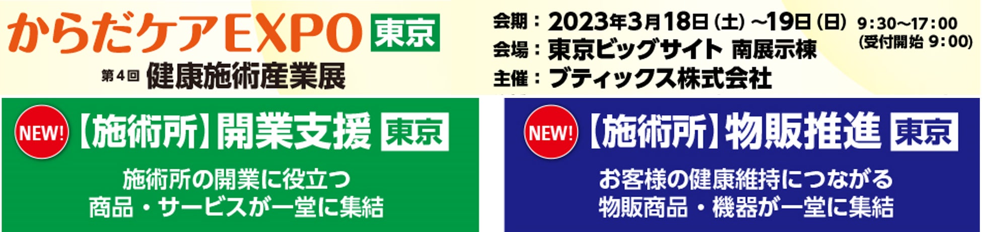 からだケアEXPO東京‘23に【施術所】開業支援 東京 および 【施術所】物販推進 東京、2つの特別専門展を新設!出展社募集中!