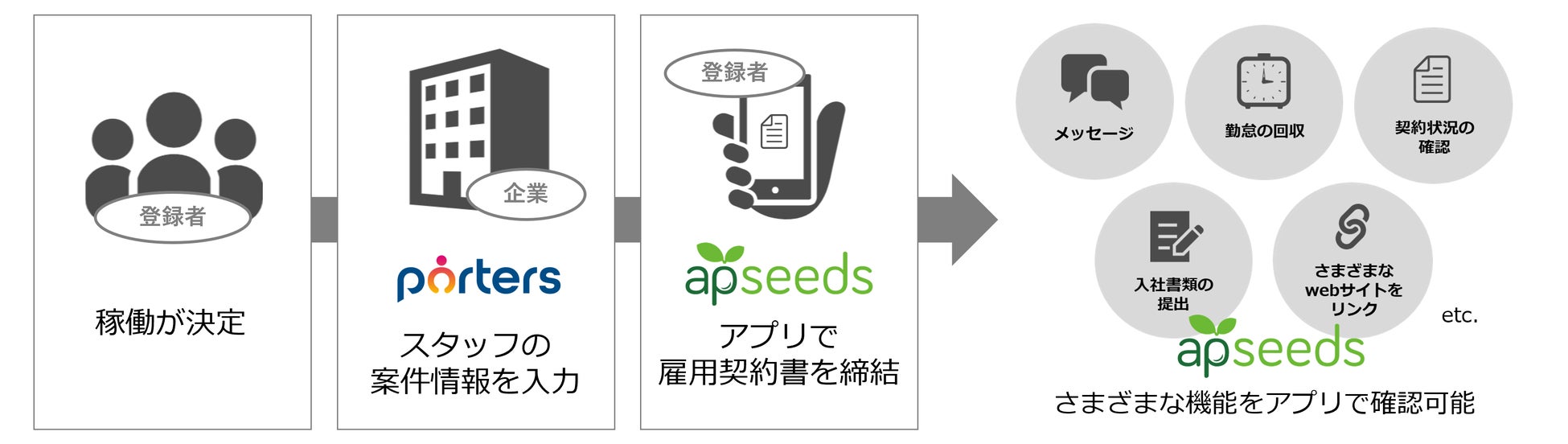 こうした背景を受け、SFAやCRM機能を備え、マッチングから契約・稼働管理に強みを持つクラウドシステム「PORTERS Staffing」は、派遣スタッフ向けアプリとして高い支持を得る「apseedsポータル」とのシステム連携の共同開発を開始しました。