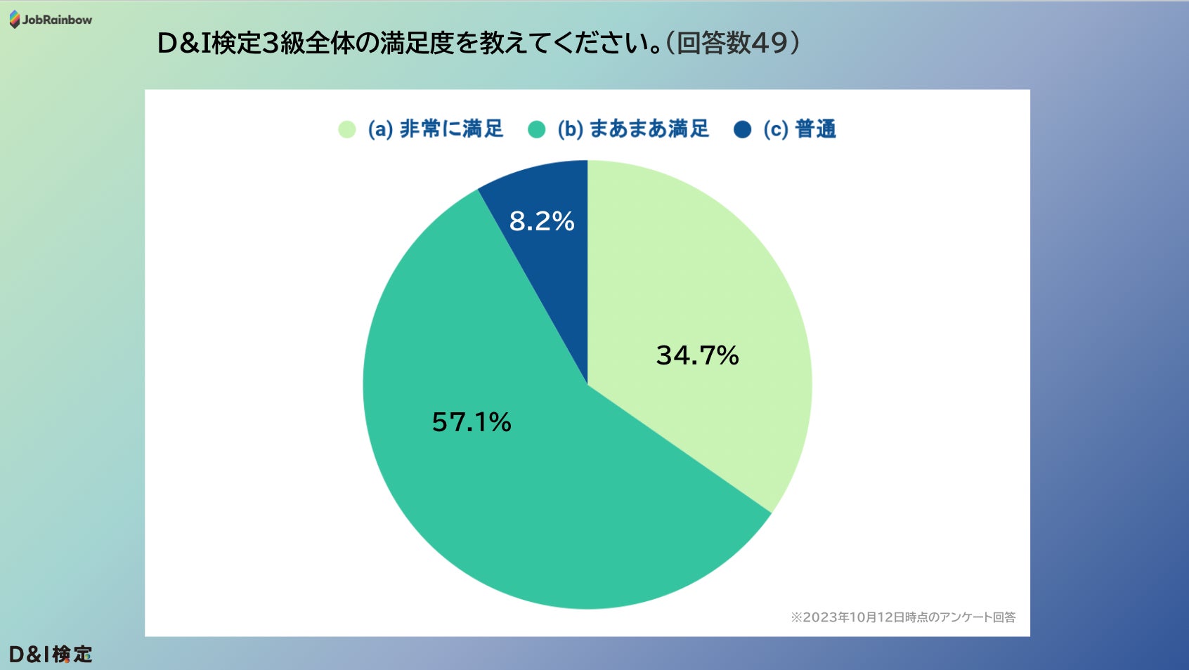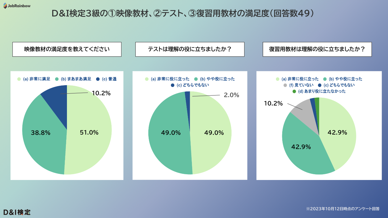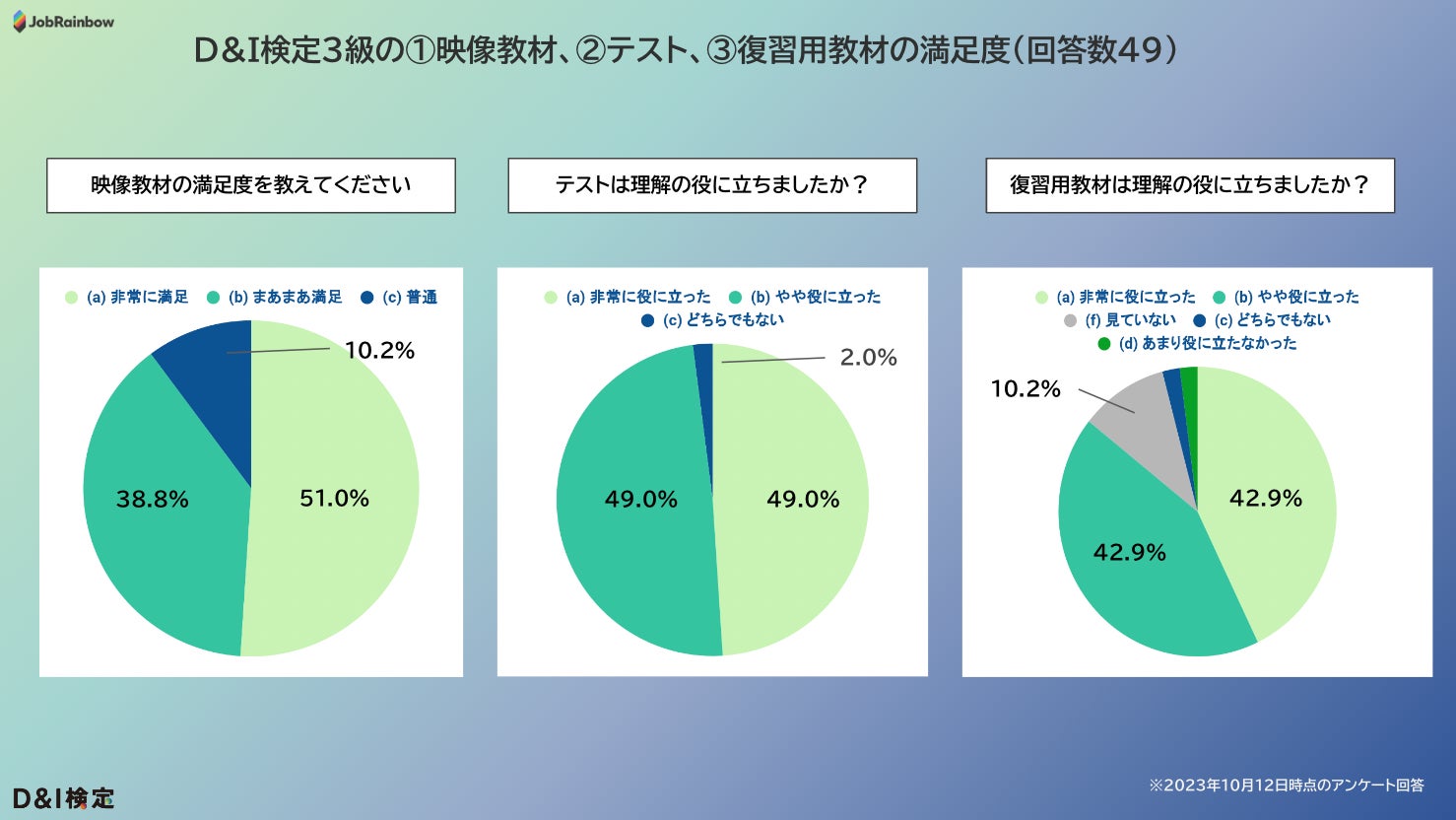 映像教材、テスト、復習用補助教材のそれぞれの満足度は、いずれにおいても、85%以上と大多数の受検者が本検定を通じて、D&Iの理解や知識を深められたと回答しています。(回答者数49名)