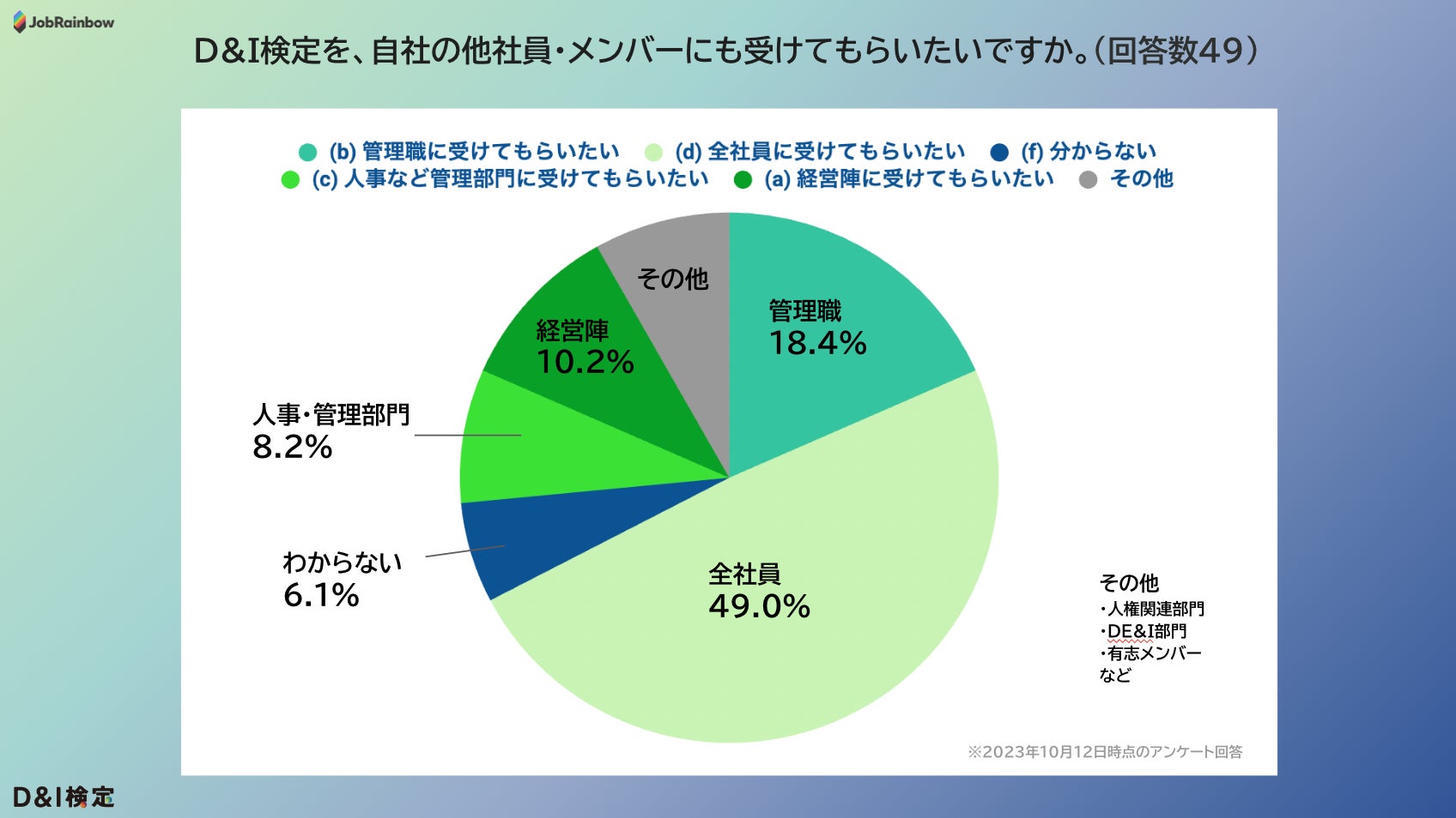 その中でも、49.0%は全社員、18.4%は管理職に受けてもらいたいと答えました。「受けてもらいたくない」の回答は0.0%でした。(回答者数49名)