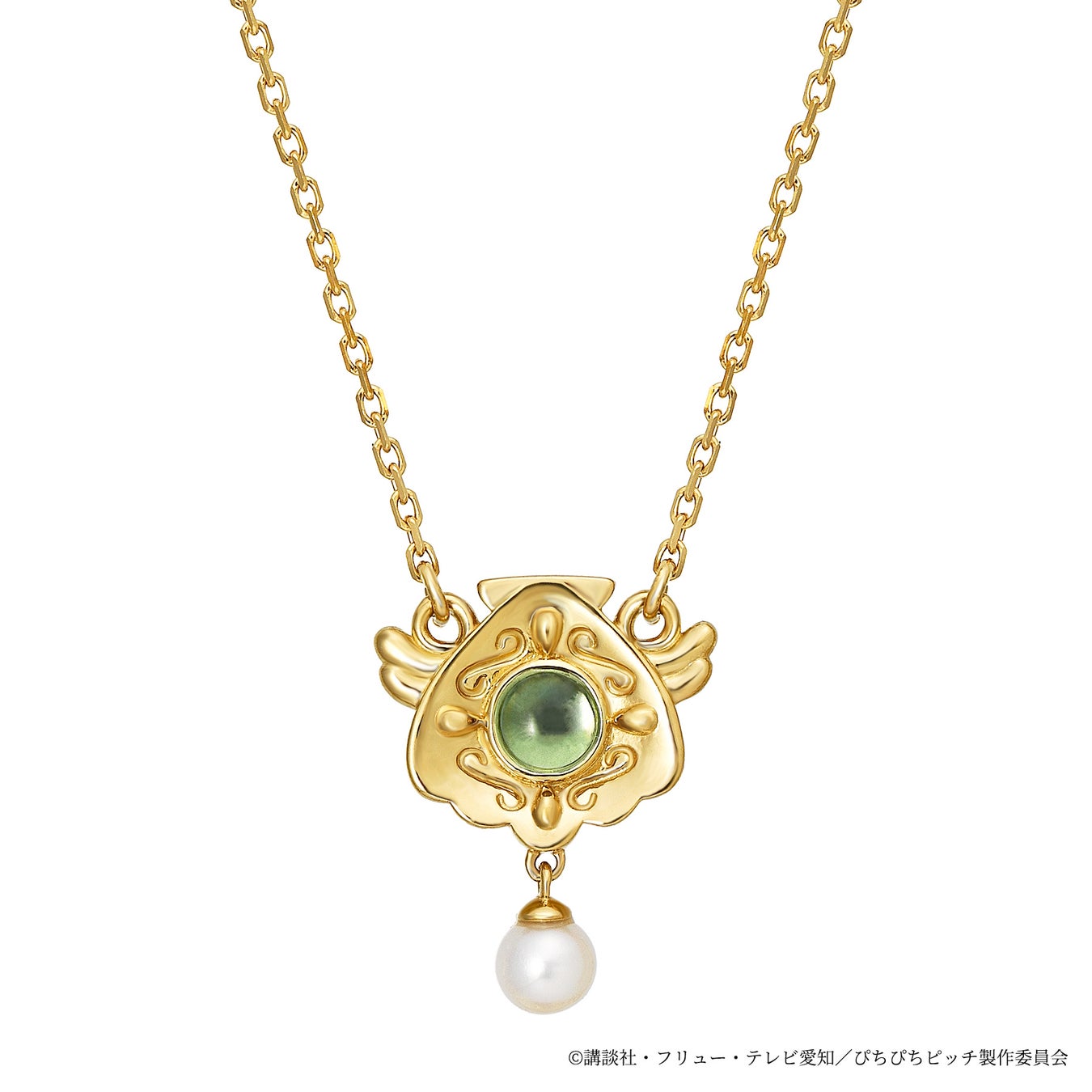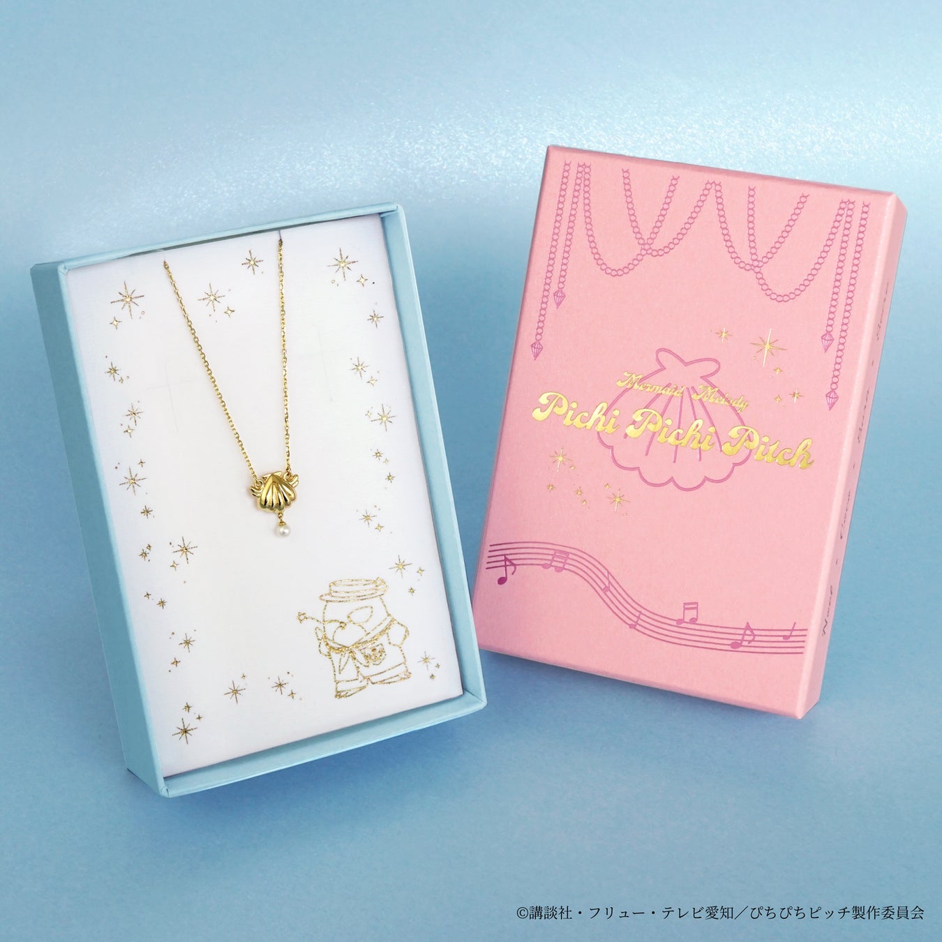 マーメイドプリンセスたちが海の女神アクア・レジーナから授かった真珠を収めているコンパクト型ペンダントをイメージしたネックレス。表はつややかなイエローゴールドの貝殻のデザインで、裏は天然石と地金の装飾でコンパクトの中を再現しました。人間と人魚の二つの姿を併せ持つプリンセスたちのように、表と裏で違った表情を楽しめるリバーシブル仕様になっているので、シーンに合わせてシンプルにもフェミニンにも着けることができます。セッティングしている天然石は各プリンセスの持つ真珠のカラーをイメージしたクリアなストーンをセレクト。貝殻の下で揺れて目を惹く優しい光沢のパールは、通称「人魚の涙」とも呼ばれており、『ぴちぴちピッチ』の世界観にもぴったりです。