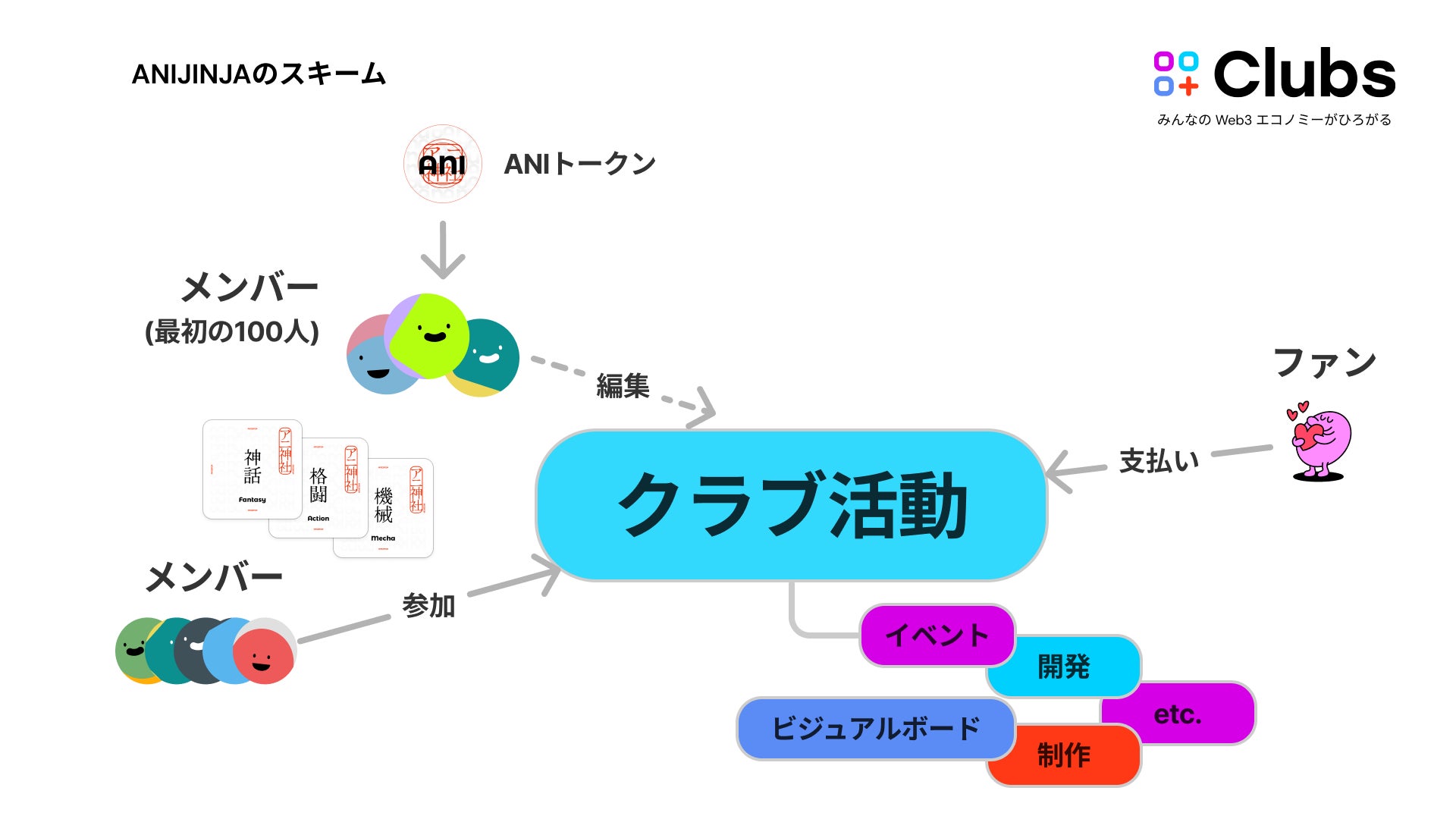 ノーコードWeb3プラットフォーム「Clubs」を開発するフレームダブルオー株式会社(本社:東京都渋谷区、代表取締役社長:原 麻由美、以降「フレームダブルオー」)は、Clubs を活用した新たなプロジェクト「ANIJINJA」を12月25日より開始しました。ANIJINJAは、アニメ・マンガ・ゲームのファンが一堂に集まり、ファン自身が主役となる「夢のプロジェクト」実現を目指すコミュニティです。最初の100人のメンバーには、特別なトークンがプレゼントされます。