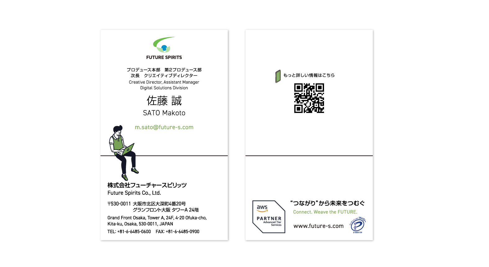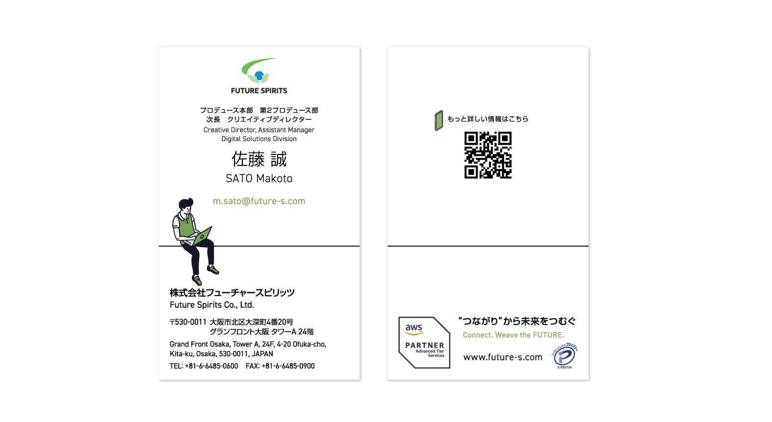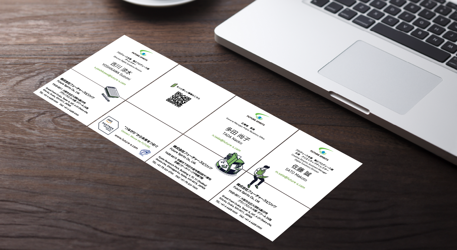 私たちは、お客さまとのコミュニケーションや個々の業務において、また社会活動のつながりのなか、小さなアクションの積み重ねを通して、フューチャースピリッツ「らしさ」を体現していくことに取り組んでいます。今回、取り組みの一環として、私たちのミッション「つながりから未来をつむぐ」を体現する名刺を作成しました。