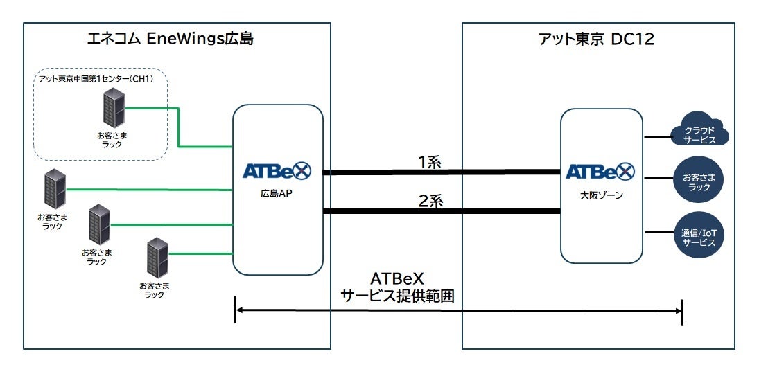 株式会社アット東京(本社:東京都江東区、代表取締役社長:中村晃、以下アット東京)はこのたび、株式会社エネルギア・コミュニケーションズ(本社:広島県広島市、取締役社長:渡部伸夫、以下エネコム)のEneWings広島データセンター内に「ATBeX(※1)広島アクセスポイント(以下、ATBeX広島AP)」を開設、2023年4月1日からサービスの提供を開始いたします。