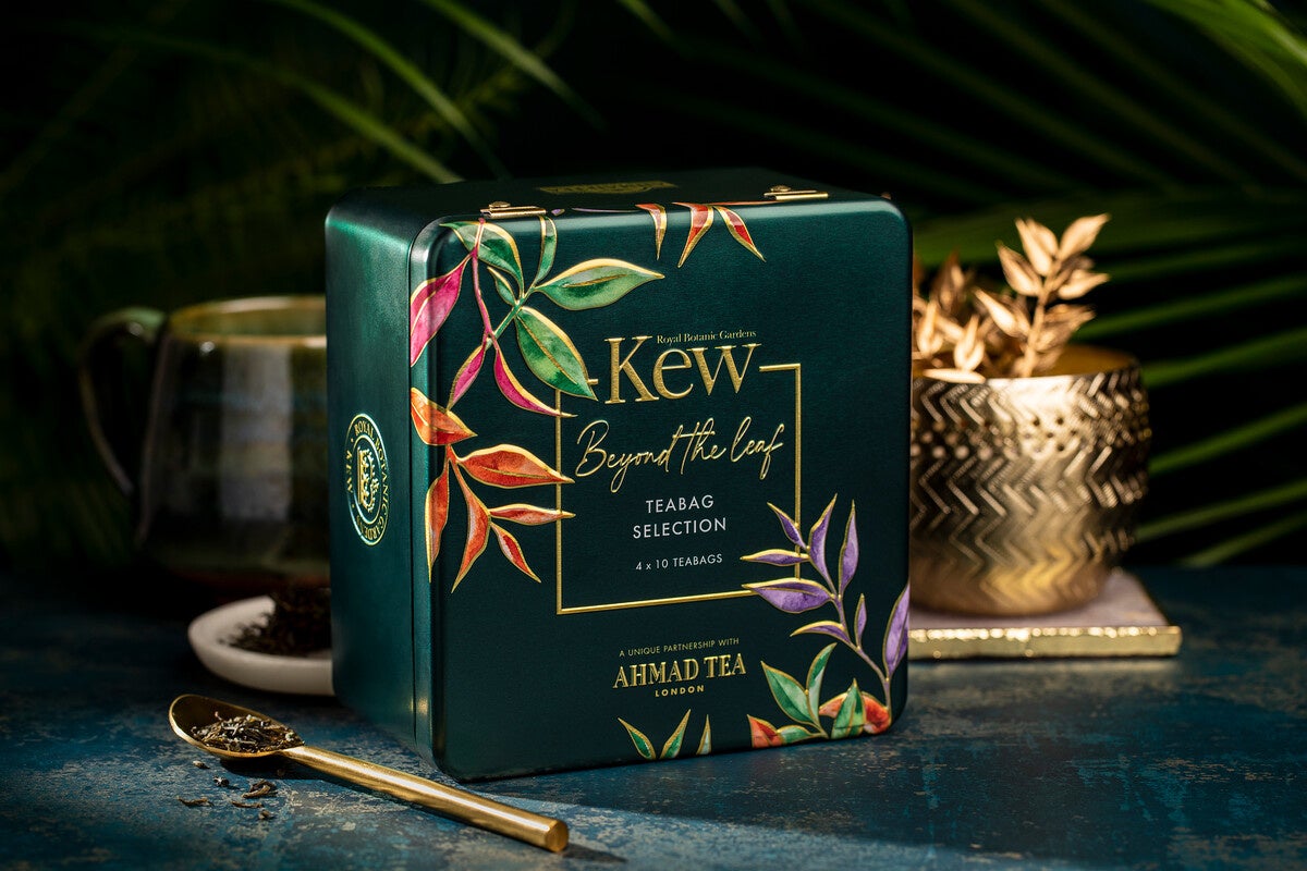 2022年3月より販売開始となったリーフティー缶(4アイテム)に加えてこの秋登場する新作は、4種類のティーバッグを1つに詰め合わせたセレクション缶。ボタニカルをコンセプトとした高級感のあるパッケージには、キューガーデンのロゴがあしらわれています。