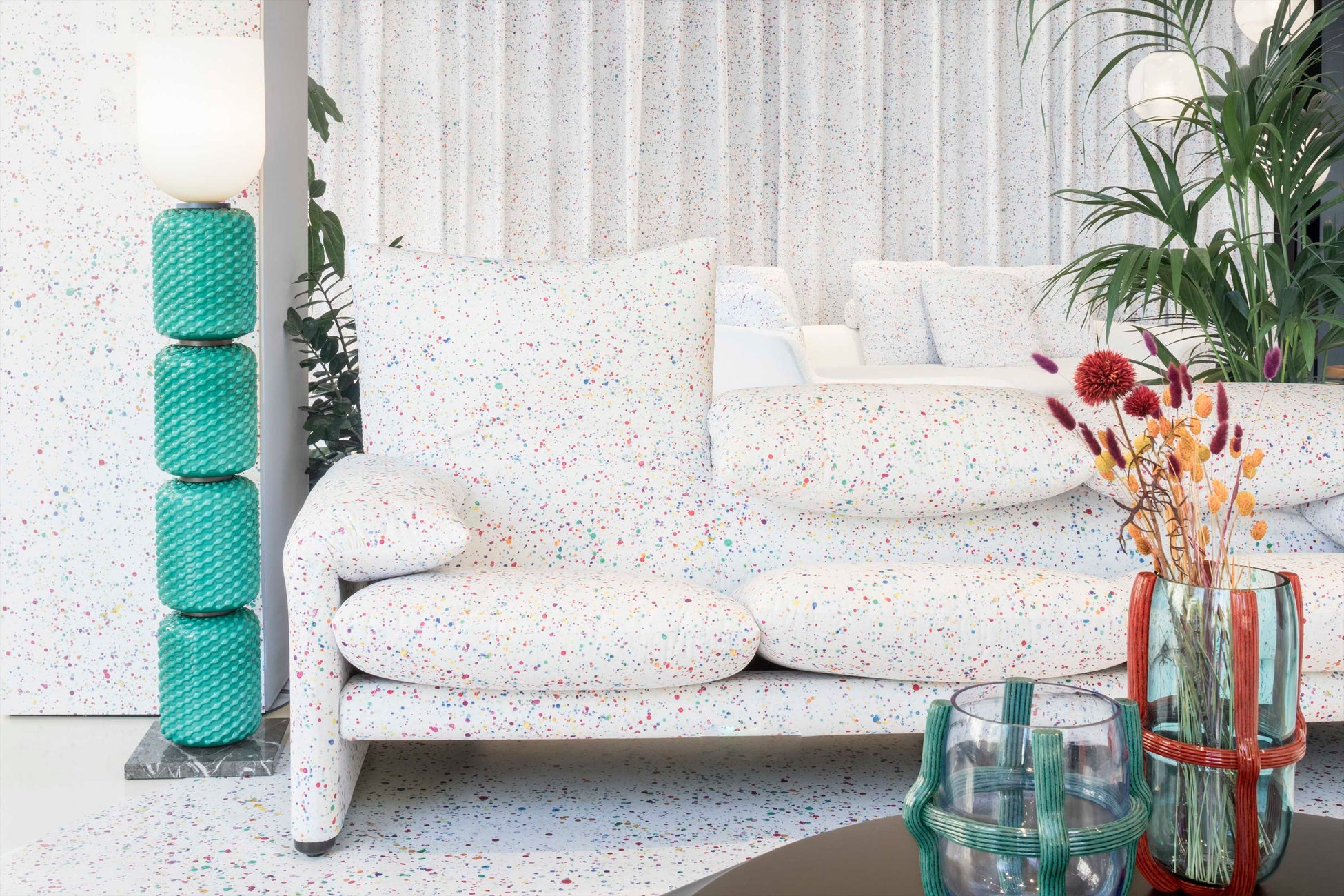 抽象芸術からインスピレーションを得たファブリックを身にまとった特別仕様。ベルベットの白いキャンバスに無数のカラフルな水しぶきが鮮やかにはじけ飛び、内なる感情を爆発させたような清々しさが感じられます。