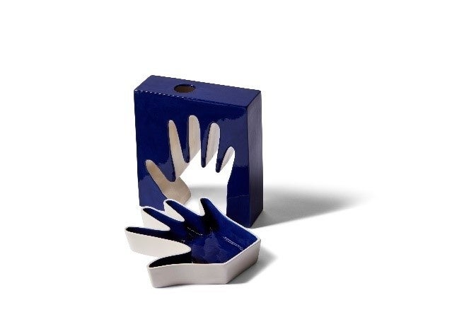 イコ&ルイーザ・パリージによるIMPRONTAコレクションは、家の中を装飾するプレタポルテのオブジェです。1960年代の典型的な芸術様式に則った、視覚的、色彩的にインパクトのある作品。Manoベースの中央はパリージの手と思われる形にくり抜かれており、上面には花を一輪挿すための穴が開いています。一方、開いた手の形をしているManoトレーは、小物入れとしてお使いいただけます。