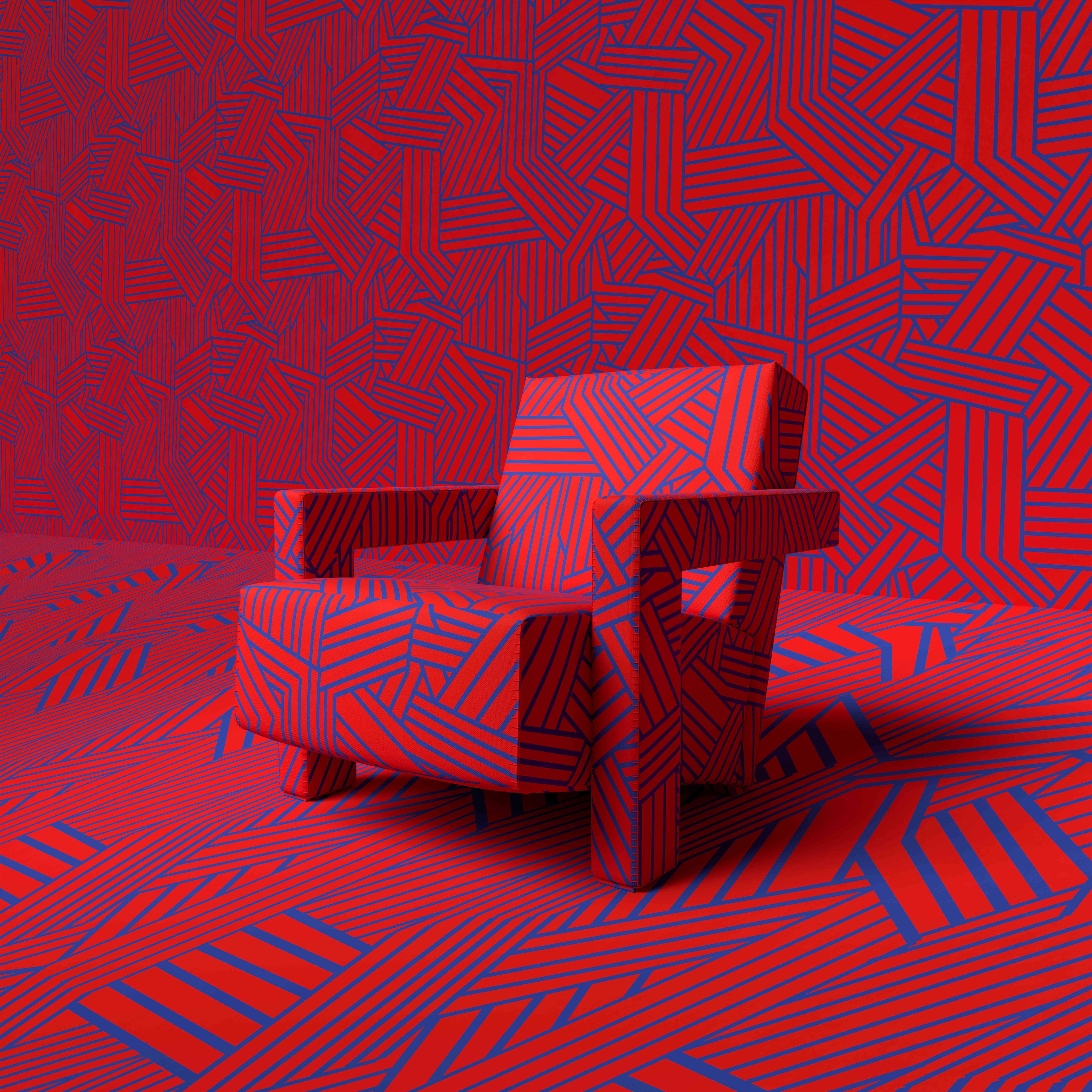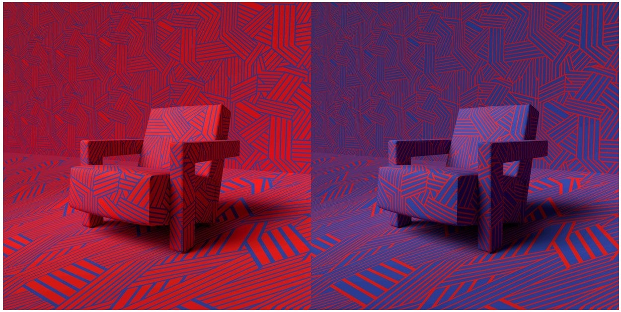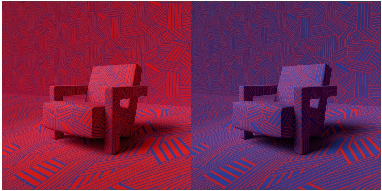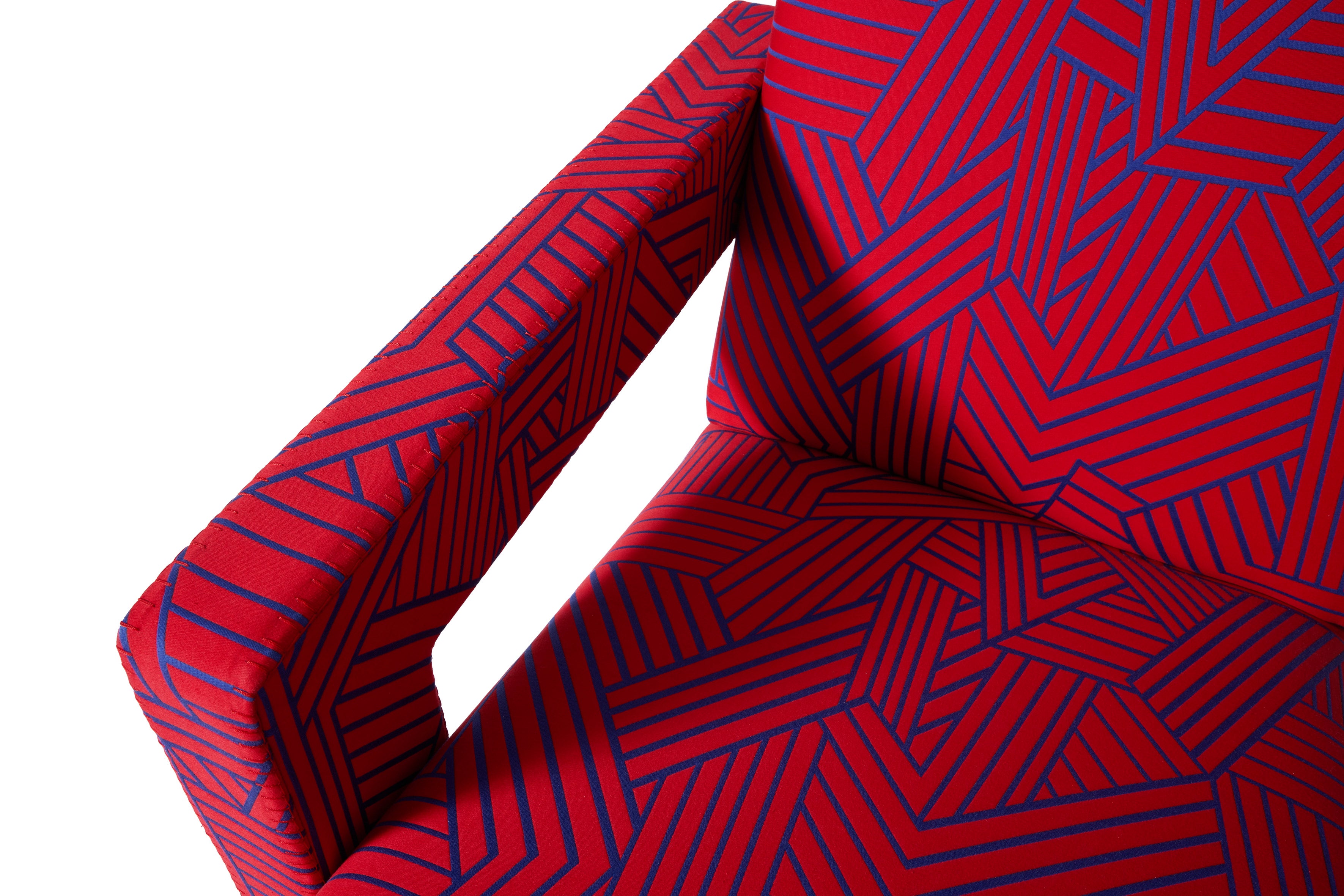 幾何学模様のファブリックをまとったリミテッドエディション。自然からのインスピレーションを得たこのオリジナルファブリックは、形と色が組み合わさり、針葉樹の葉の隙間から差し込む赤い夕陽を思わせる、生き生きとしたパターンを生み出しています。