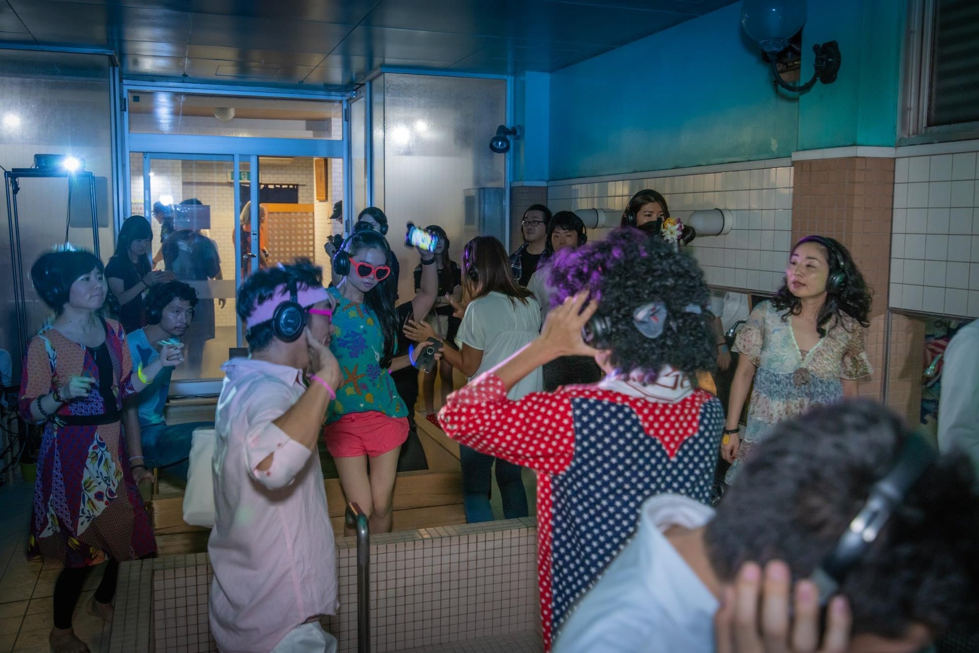 例えば、風呂とフロアを沸かす銭湯フェスとして、下町の銭湯をサイレントディスコシステムを用いて”無音で踊れるダンスフロア”に変え、業界を沸かせてきた「ダンス風呂屋」(2017~2018)を模した銭湯。