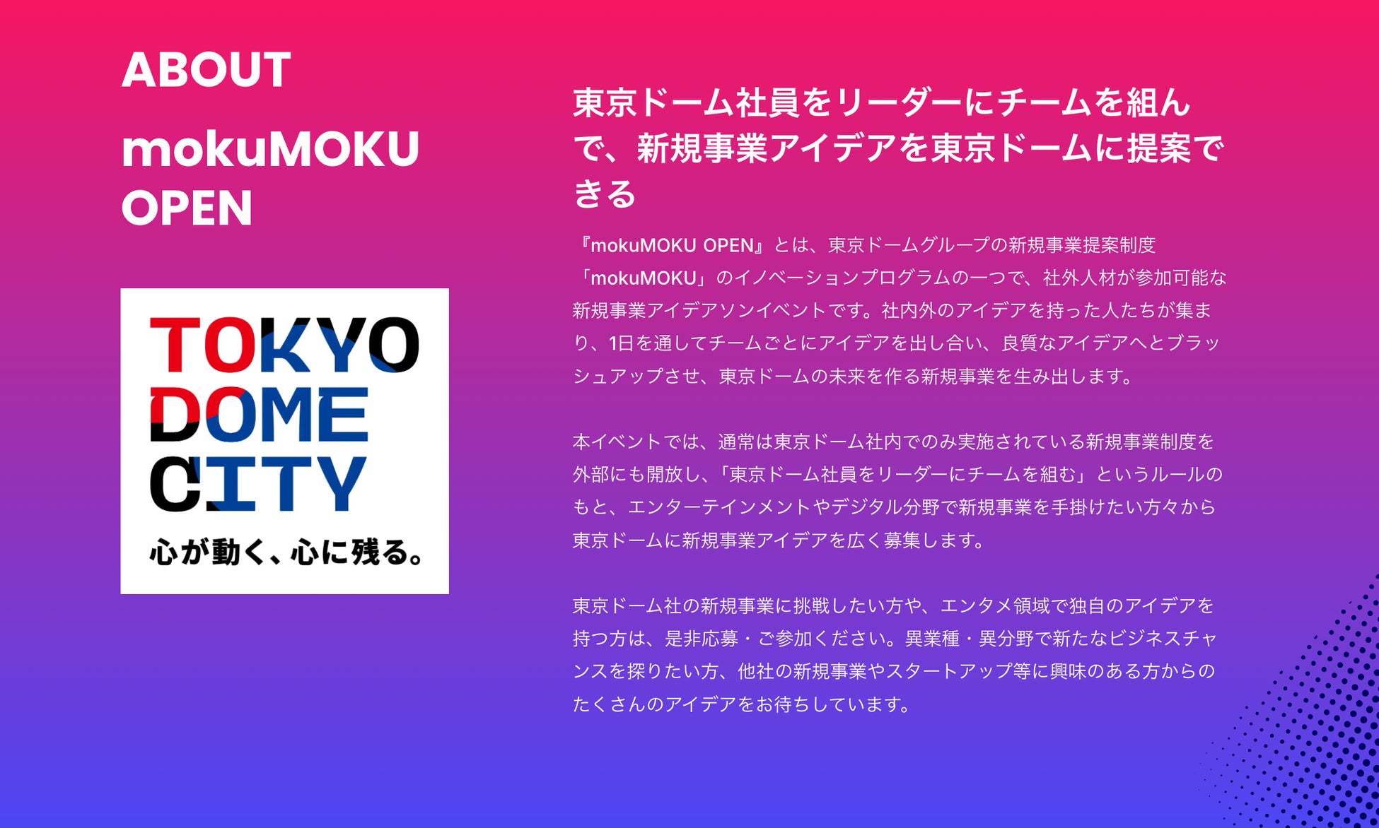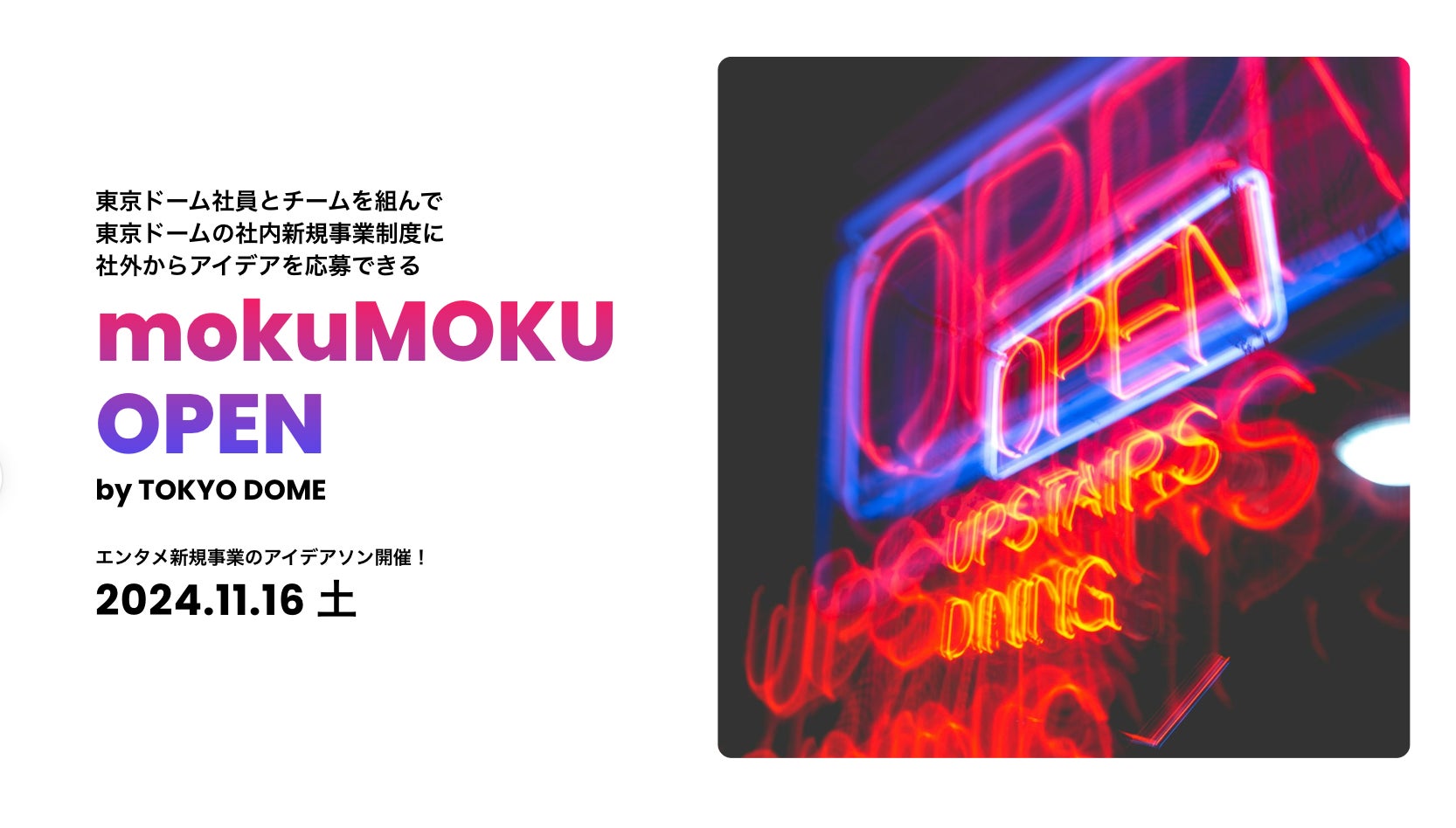 東京ドーム社員とチームを組んで新規事業制度に社外から応募できる『mokuMOKU OPEN』初開催!