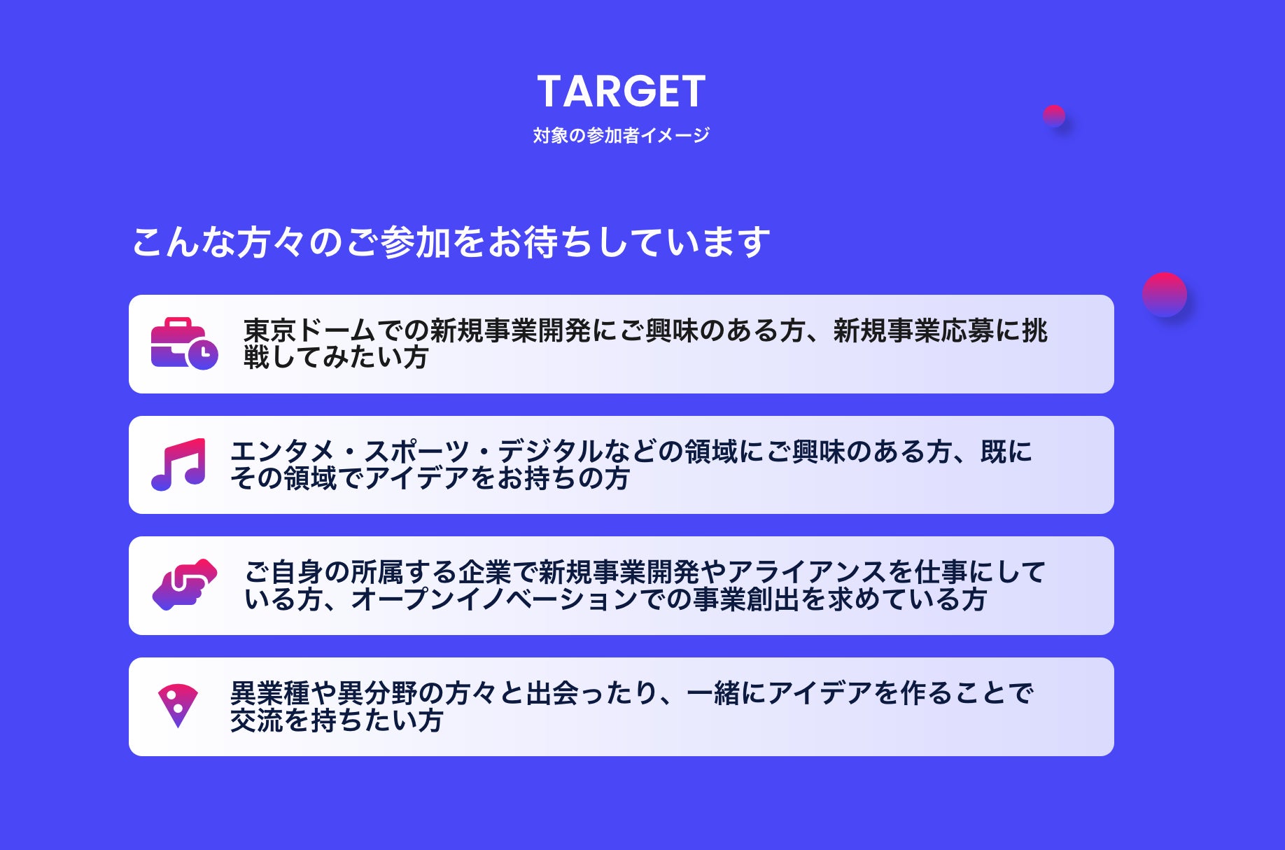 東京ドーム社の新規事業に挑戦したい方や、エンタメ領域で独自のアイデアを持つ方は、是非応募・ご参加ください。異業種・異分野で新たなビジネスチャンスを探りたい方、他社の新規事業やスタートアップ等に興味のある方からのたくさんのアイデアをお待ちしています。