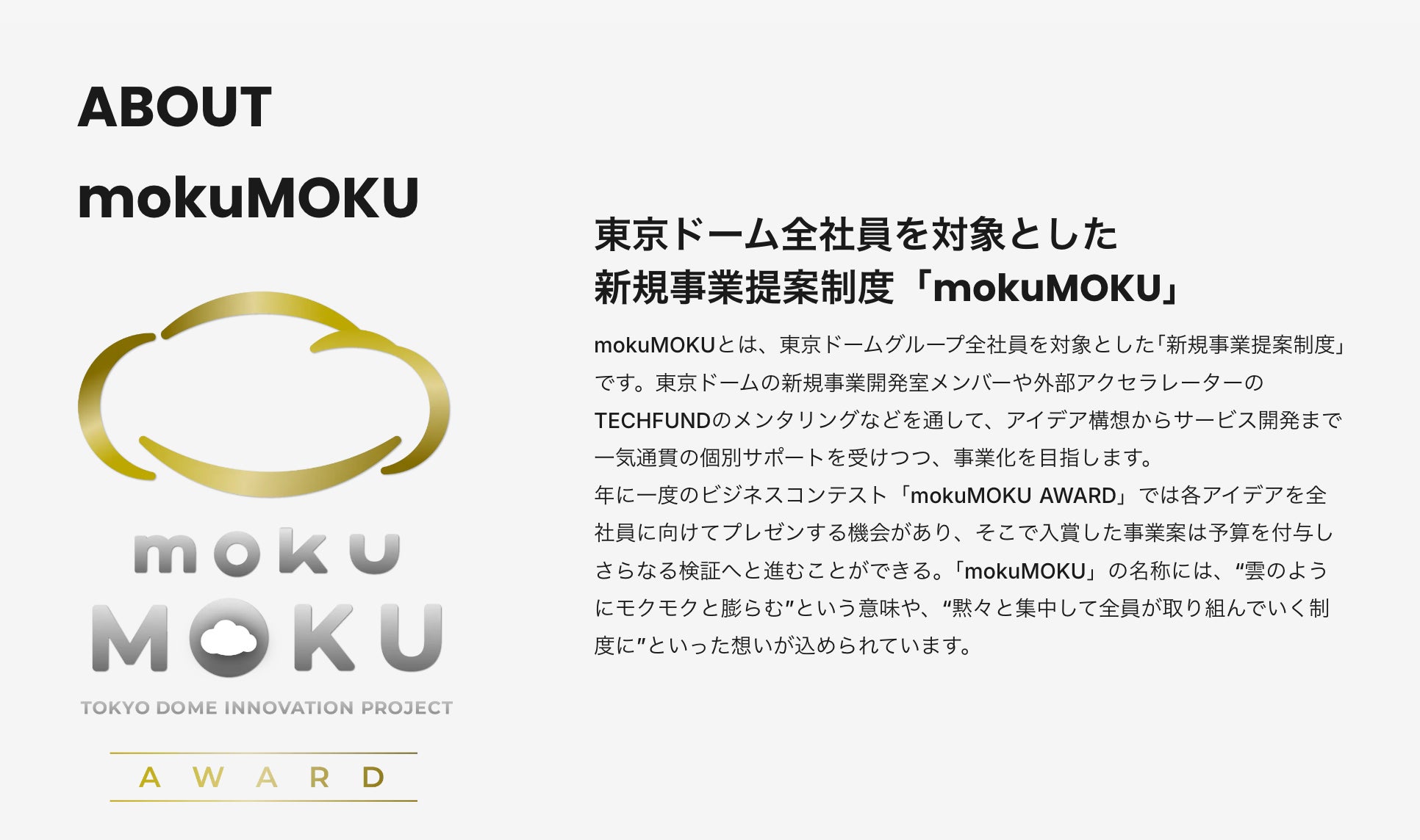 年に一度のビジネスコンテスト「mokuMOKU AWARD」では各アイデアを全社員に向けてプレゼンする機会があり、そこで入賞した事業案は予算を付与しさらなる検証へと進むことができる。「mokuMOKU」の名称には、“雲のようにモクモクと膨らむ”という意味や、“黙々と集中して全員が取り組んでいく制度に”といった想いが込められています。