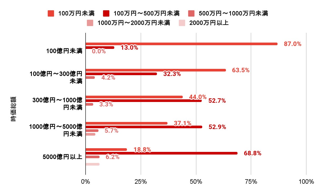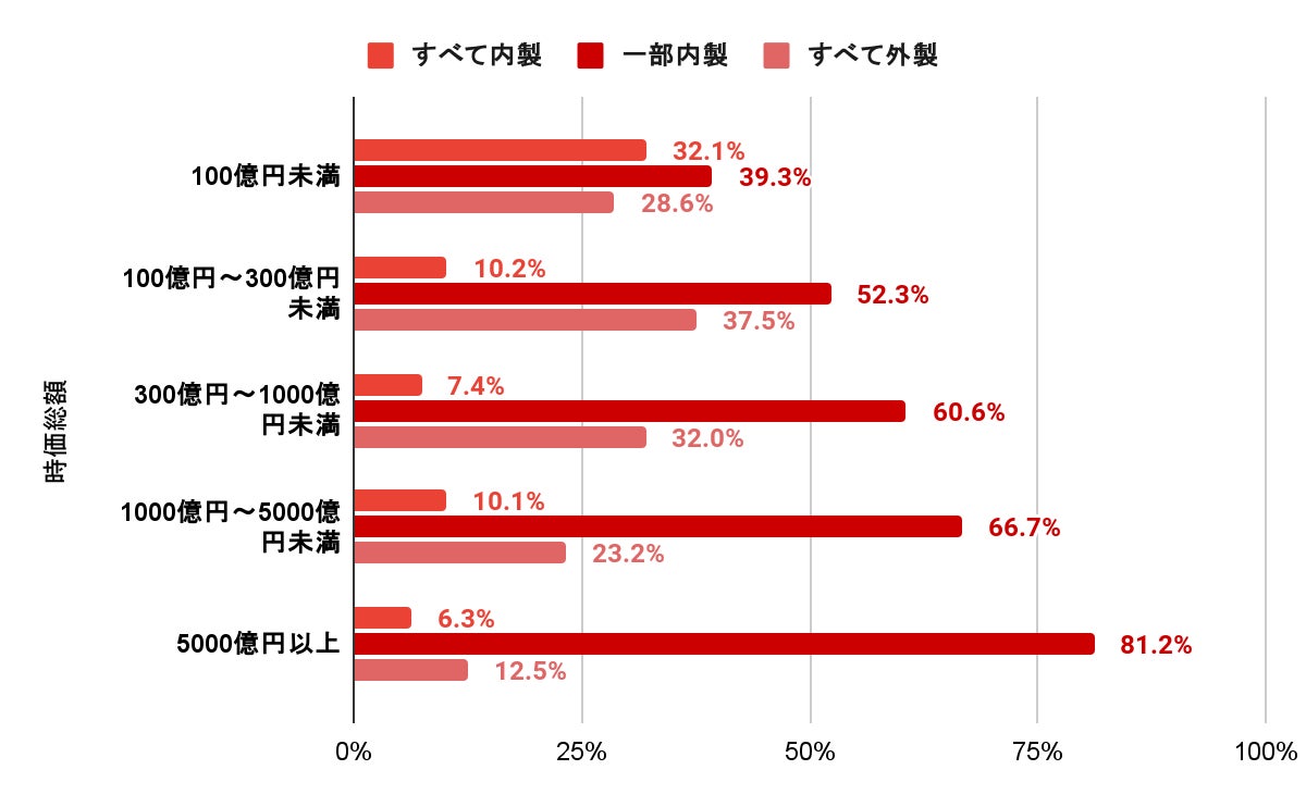 時価総額別に見ると、「すべて内製」の割合が最も高いのが100億円未満企業