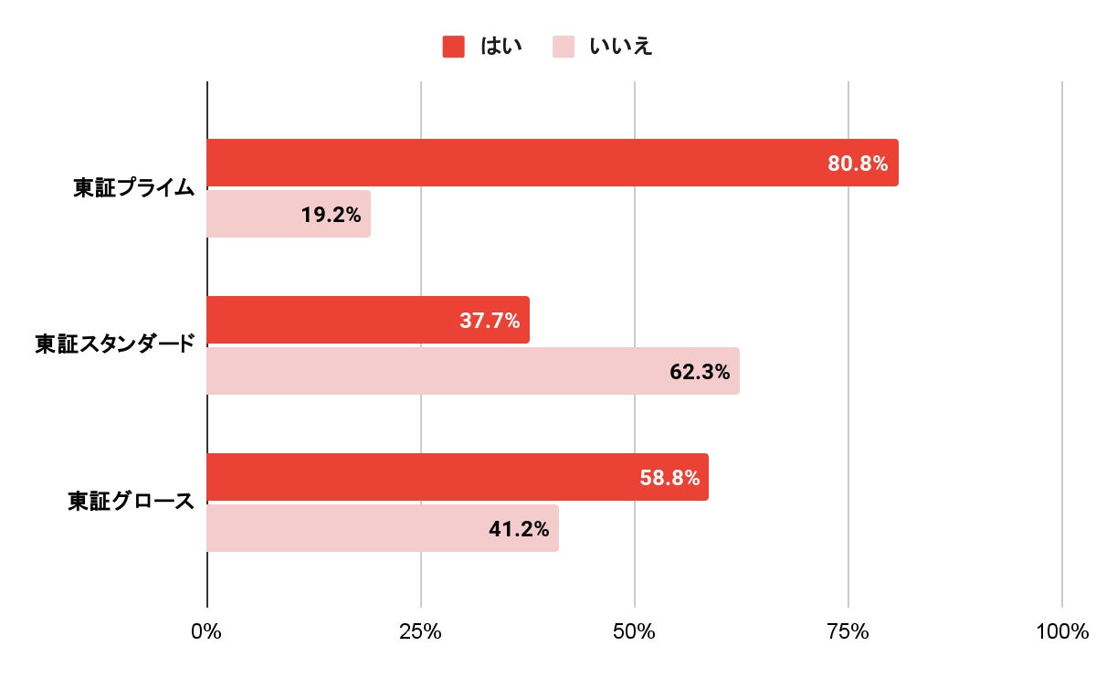 67.5%の企業が今後英文開示を拡大する意向を示しました(図1)。しかし、市場区分別に見ると、東証プライム市場では80.8%、東証グロース市場では58.8%、東証スタンダード市場では37.7%と、市場ごとに格差が生じています(図2)。