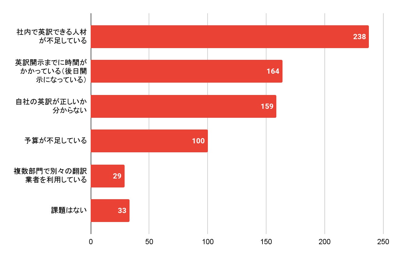 上位から、「社内で英訳ができる人材が不足している」「英文開示までに時間がかかっている」「自社の英訳が正しいかわからない」