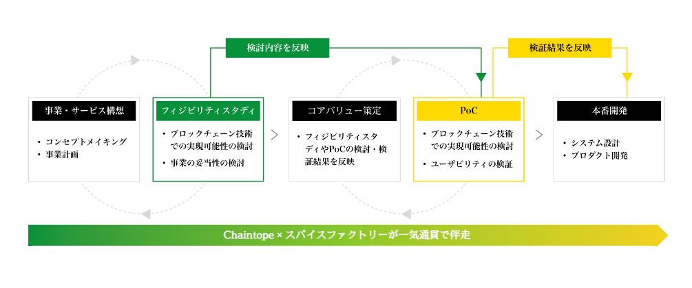 創業よりアジャイル型開発を進めてきたスパイスファクトリーが、アイディア創出の段階から、実際に触ってみることができる「プロトタイプ」を高速で開発します。プロトタイプを使用し、ユーザー提供価値に焦点を当てて調査を実施します。計画内容の実現可能性を調査によって洗い出すことにより、新規事業の実現性を高めることが可能です。また、Chaintopeはブロックチェーンを活用したビジネスモデルの設計から支援し、技術面および運用面での課題発見や実現可能性を共に調査・検討した上で、技術力に根ざした提案をおこないます。