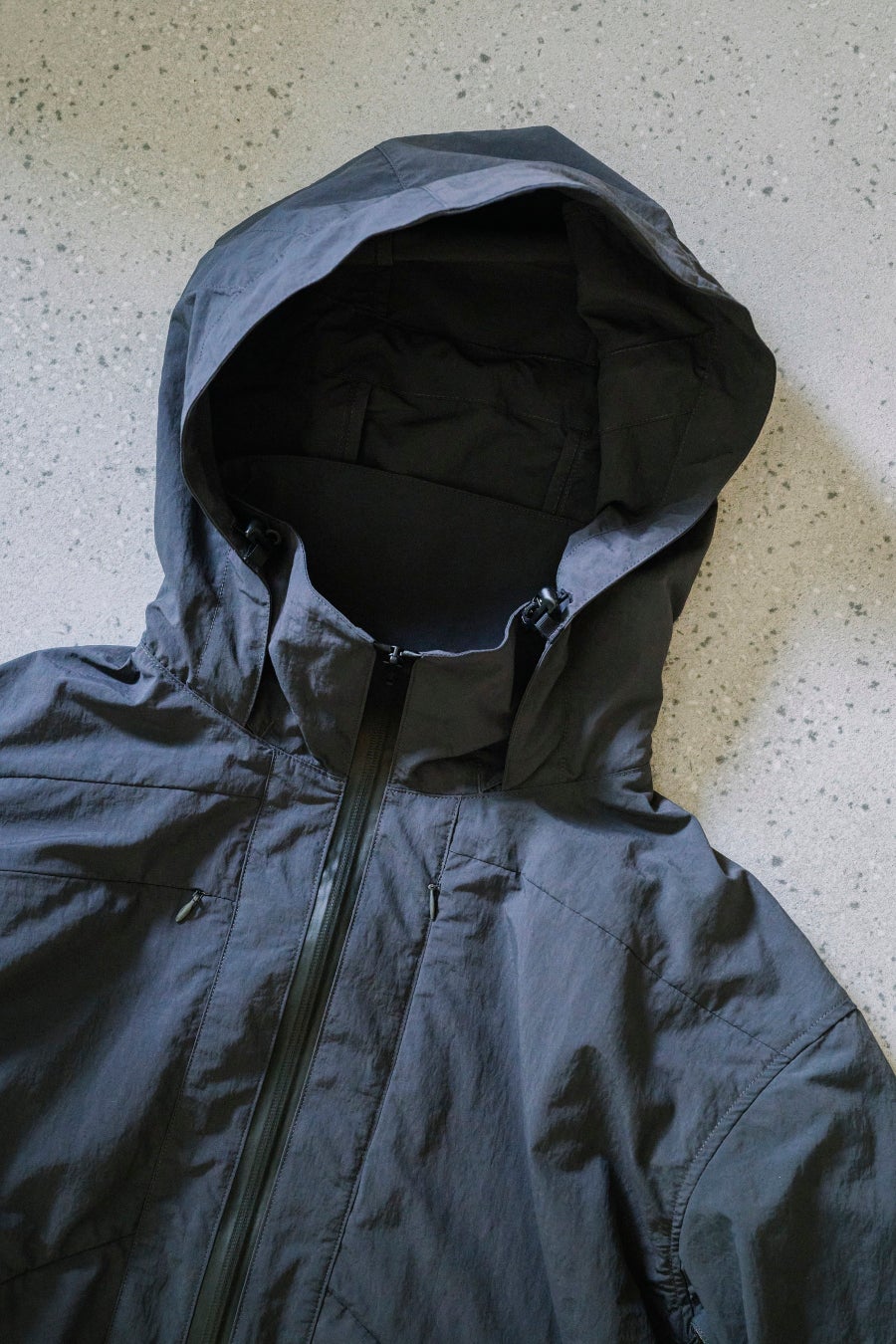 フードは立ち襟に収納できるタイプで、急な雨が降った際にすぐに利用でき、普段バックパックなどを背負う際にも邪魔にならないデザインにしました。さらに、フードサイズやフィット感を調整できるスピンドル(紐)が付いています。