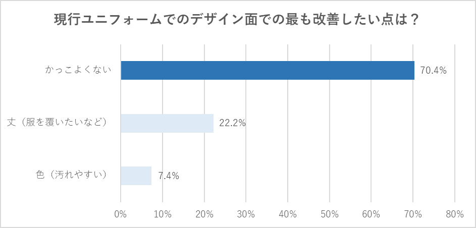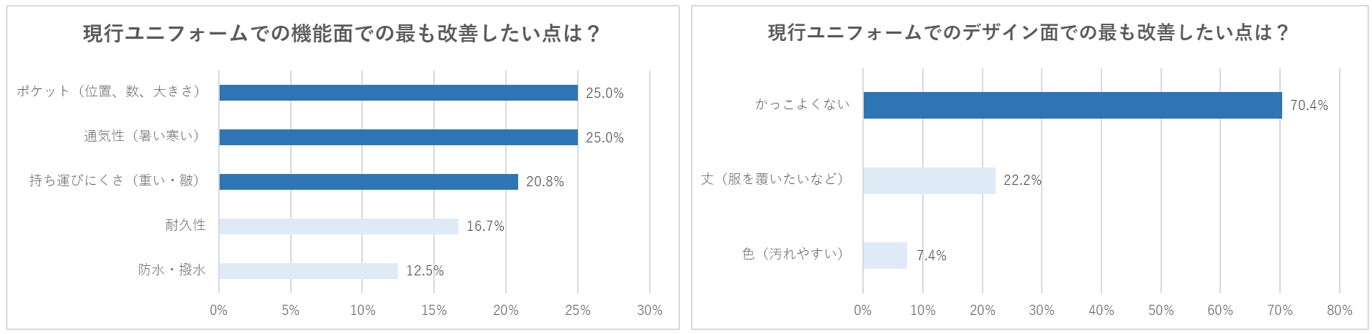 ユニフォームを持っていた従業員にアンケートを実施したところ、現行のユニフォームの改善点として「ポケットの位置や数、大きさ」「通気性」「持ち運びにくさ」など機能面の課題が挙げられました。フリー回答で挙げられた細かな要望を踏まえ、新ユニフォームはこれらの課題を解決する新たな機能を採用しています。