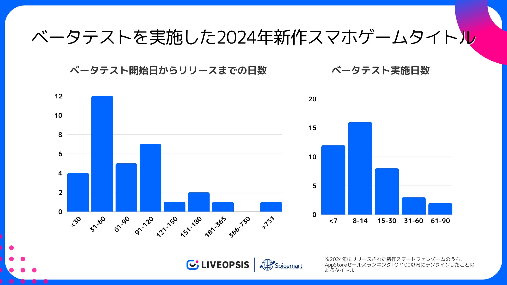 株式会社スパイスマートは、2024年にリリースされたスマートフォン向け新作ゲームを対象に、ベータテストの実施状況とヒットとの関連性について調査・分析を行いました。これはスパイスマートで毎年おこなっている調査となり、今年で3年目となります。