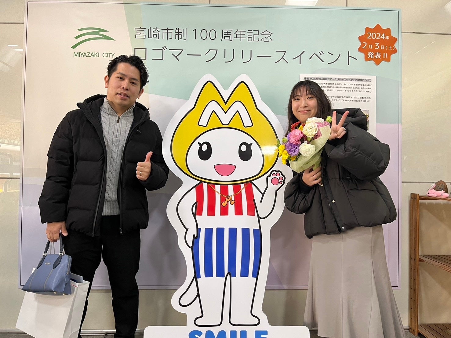 宮崎市制100周年記念ロゴマークは、宮崎市出身の漫画家である東村アキコ氏がデザインし、シンボルマークと「SMILE MIYAZAKI」のロゴタイプから構成されます。また、同氏がデザインしたキャラクター「みやねこ」も誕生しました。