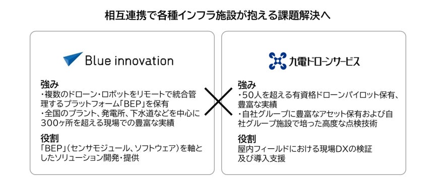 当社は、2019年から九州電力株式会社において九州全域を対象に、ドローンを活用した空撮、点検、及び、測量などのサービスを提供して参りました。この度、2024年4月に、九電ドローンサービス株式会社を設立し、従来提供していたサービスメニューのほか、ロボットやAI解析のソリューションを含めた新たな点検サービスや自社開発ソフトの提供を全国に提供することを目的に、協業パートナーの拡大を図っていく予定です。従来、ブルーイノベーション様とはELIOSやAGVなどのインフラ設備の点検ソリューションで連携してきましたが、今後は、全国の様々な点検ニーズに応えていくため、共同で新たな点検ソリューションを検討・開発して参りたいと思います。