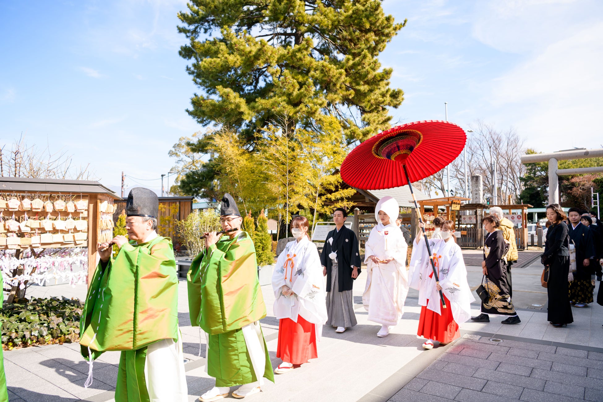 挙式では、新郎は黒紋服、新婦は自髪で結い上げた日本髪に綿帽子をまとい、白無垢姿で参列者の前に立ちました。穏やかな陽光のもと、歴史ある境内に凛とした和装が映え、厳かな空気が広がりました。