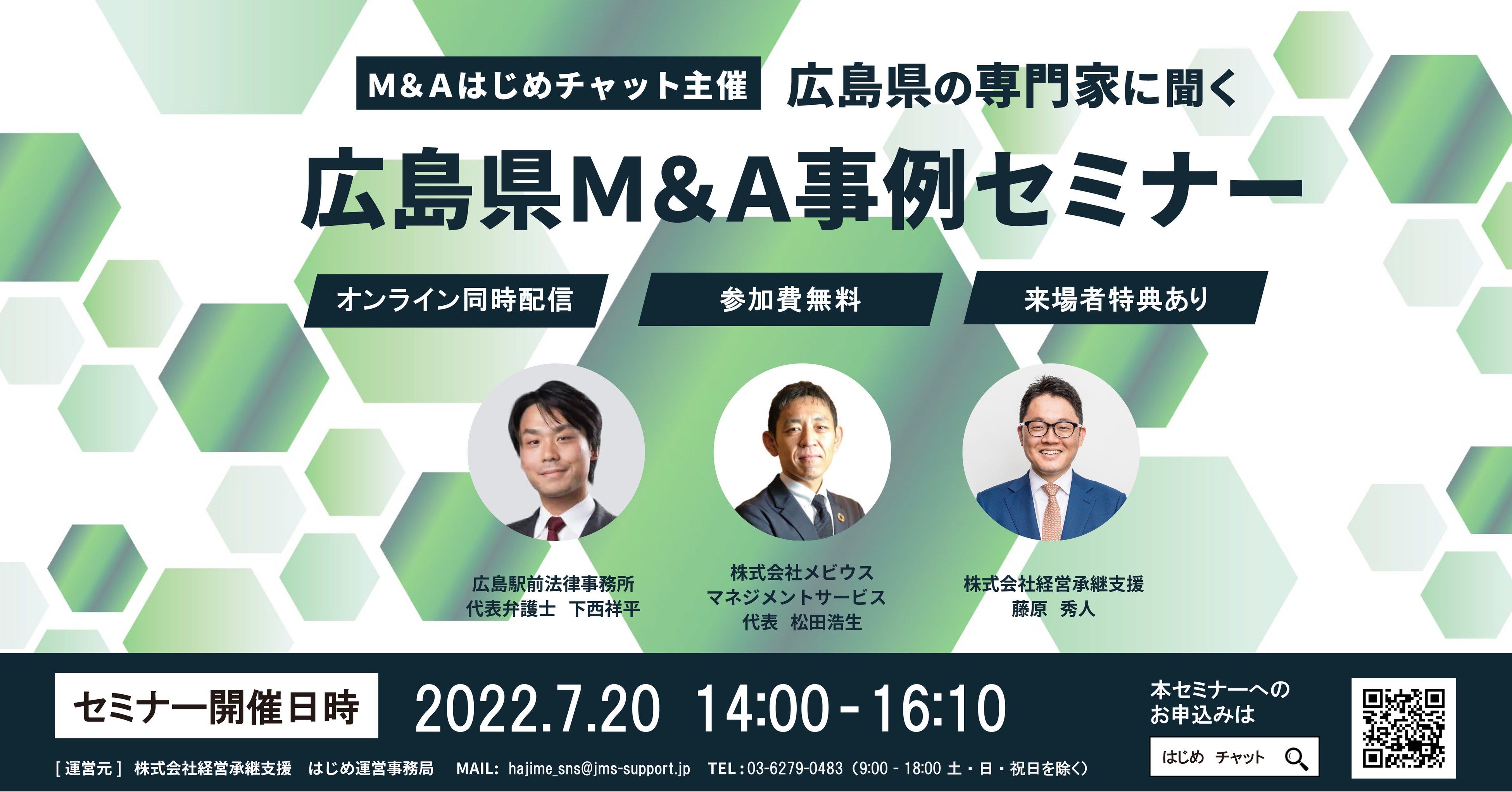株式会社経営承継支援(本社:東京都千代田区、代表取締役:笹川敏幸、以下JMSS)、広島駅前法律事務所(本事務所:広島県広島市、代表弁護士:下西祥平)、株式会社メビウスマネジメントサービス(本社:広島県広島市、代表取締役:松⽥浩⽣)は、7月20日(水)に、対面・オンラインの同時セミナー『広島県M&A事例セミナー』を開催いたします。