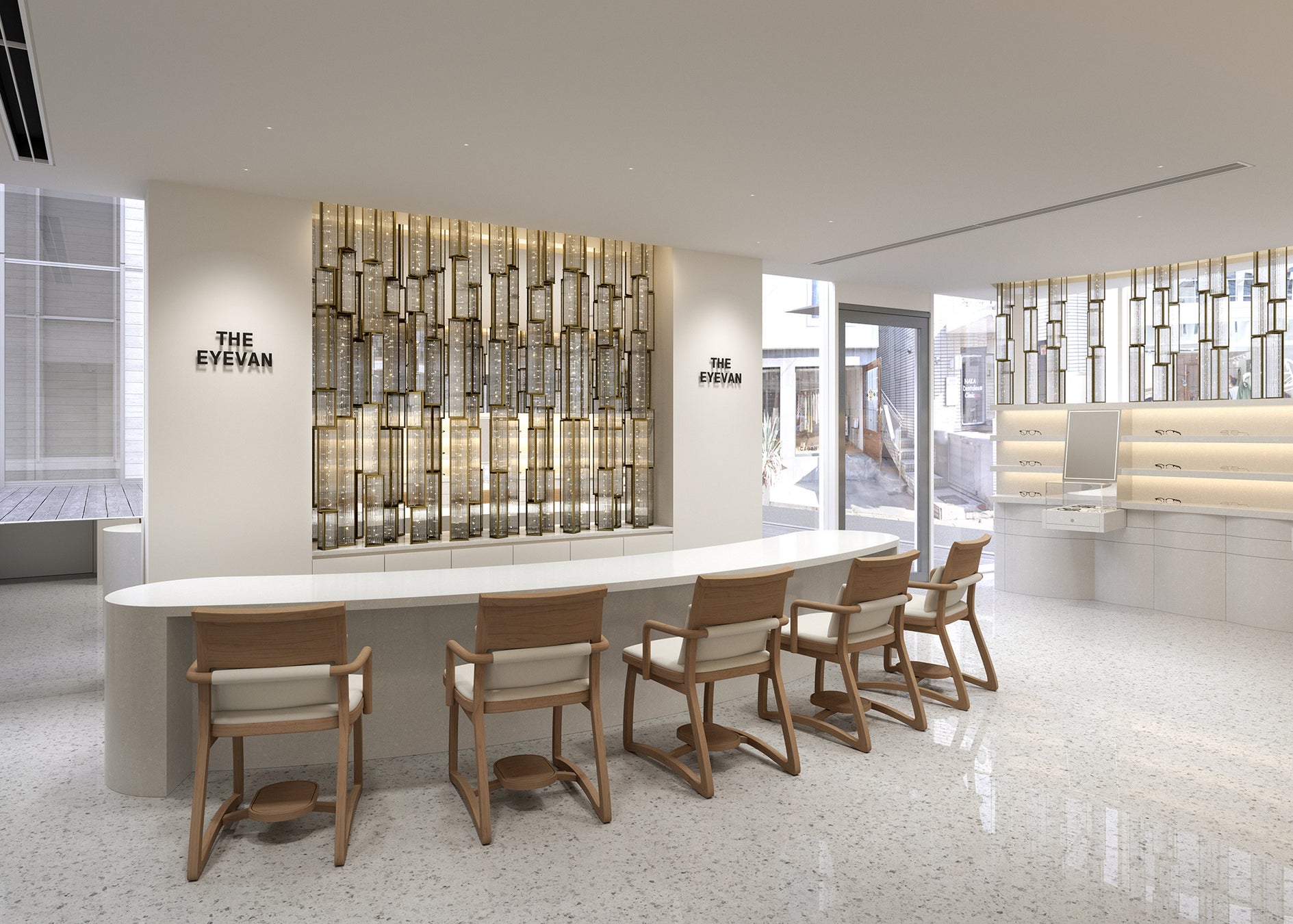 店舗内装は一号店の京都祗園、二号店の名古屋栄に続きGLAMOROUS co.,ltd.森田恭通氏によるもの。開放感があるガラス建築の中にオリジナルデザインのモールガラスによる無数の光の粒が煌めき、セレクトされたアイウェアが並んだギャラリーは、一人一人のお客さまにゆっくりとブランドの世界観を体験していただける空間を作り出しています。