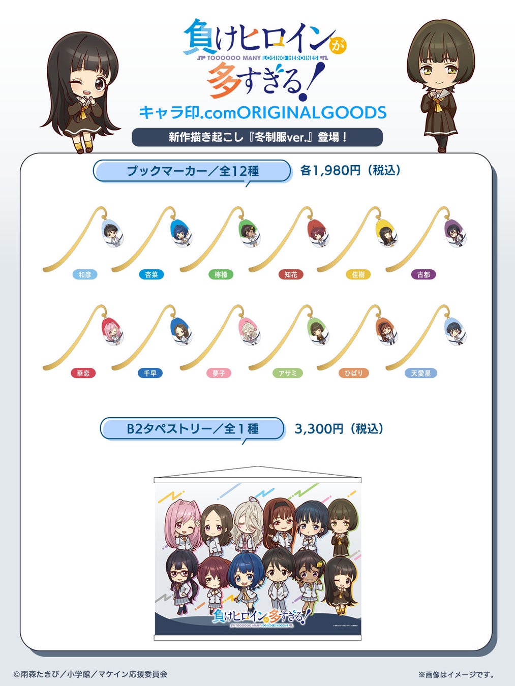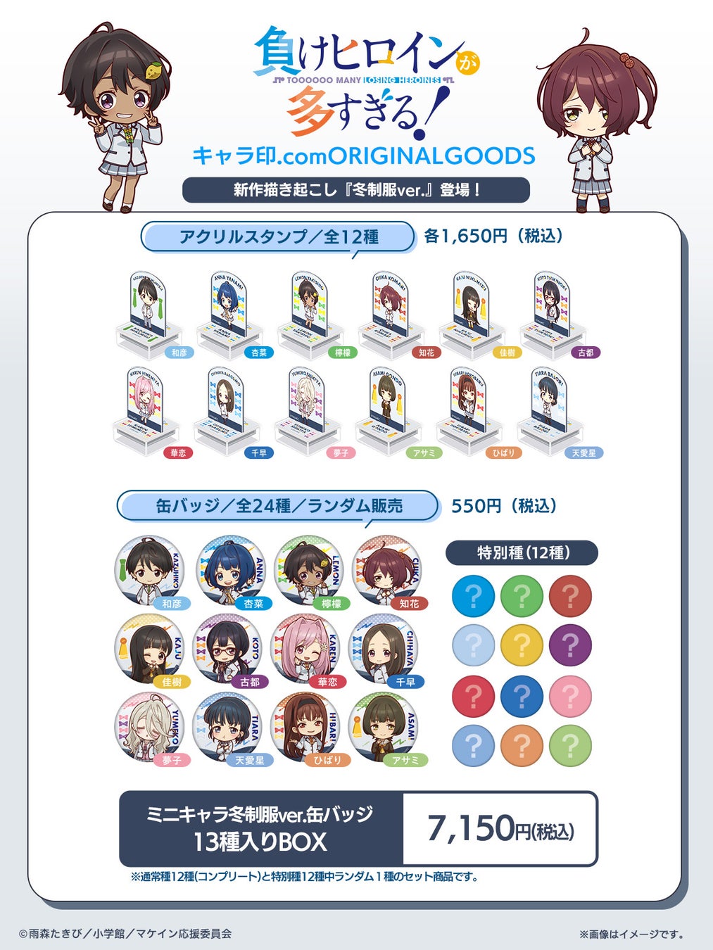 TVアニメ『負けヒロインが多すぎる!』のファン必見!この度、99種に及ぶキャラ印.comオリジナル新グッズの発売が決定いたしました!おなじみの夏制服ミニキャライラストから一新、冬制服に衣替えしたミニキャライラストの八奈見杏菜たちが登場します。さらに精文館書店限定のミニキャライラストグッズもラインナップ!これらの新グッズは、全国の精文館書店36店舗にて、先行&限定販売されることが決定!いち早く、そしてここでしか手に入らないアイテムを手に入れるチャンスをお見逃しなく!