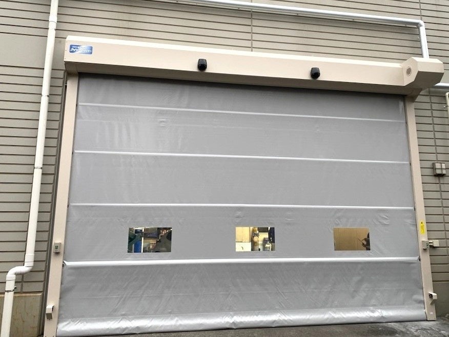 (※1)高速シートシャッター:ビニールやポリエステルなどのシート素材で作られたシャッター。一般的なスチール製シャッターに比べ軽量で、開閉が速いため、温度管理を必要とする工場や倉庫などの開口部に用いられる。出入りが多く、素早い開閉が求められる整備工場の空調維持に最適