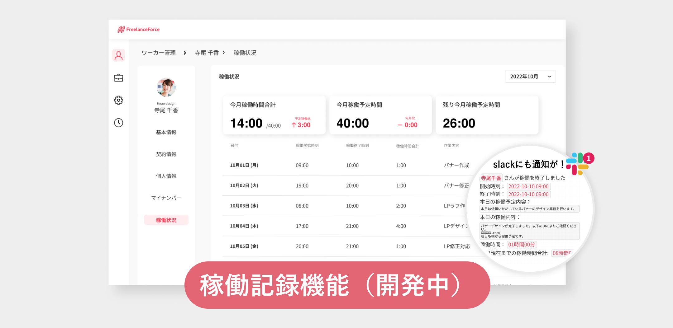 ワーカー様の稼働状況を見える化し、稼働開始・終了時に企業担当者が通知を受け取ることができます。Slackへの通知設定をすることも可能です。
