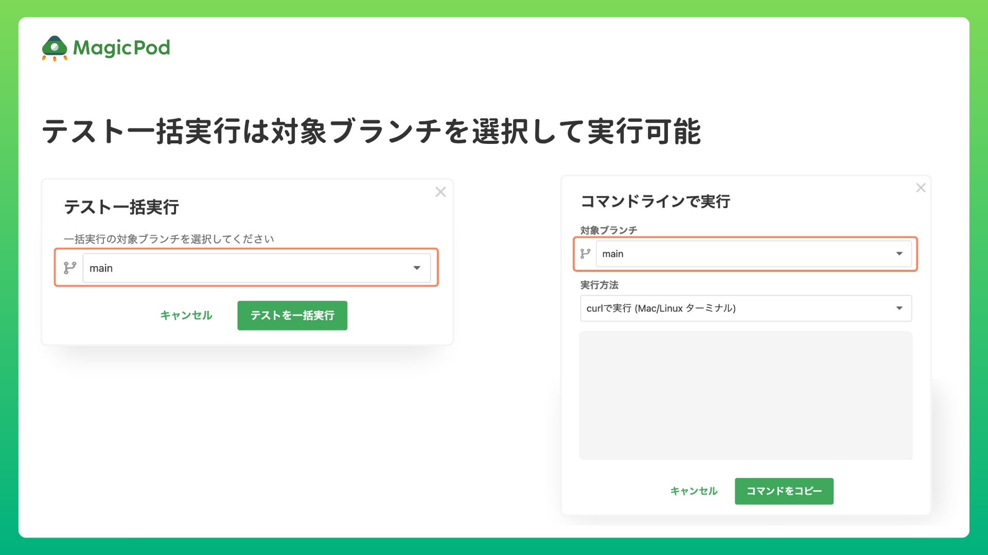 テストの一括実行時に、「どのブランチのテストを使用するか」を指定できるようになったことで、開発環境・ステージング環境・本番環境など、用途に応じたテストの切り替えが可能になりました。