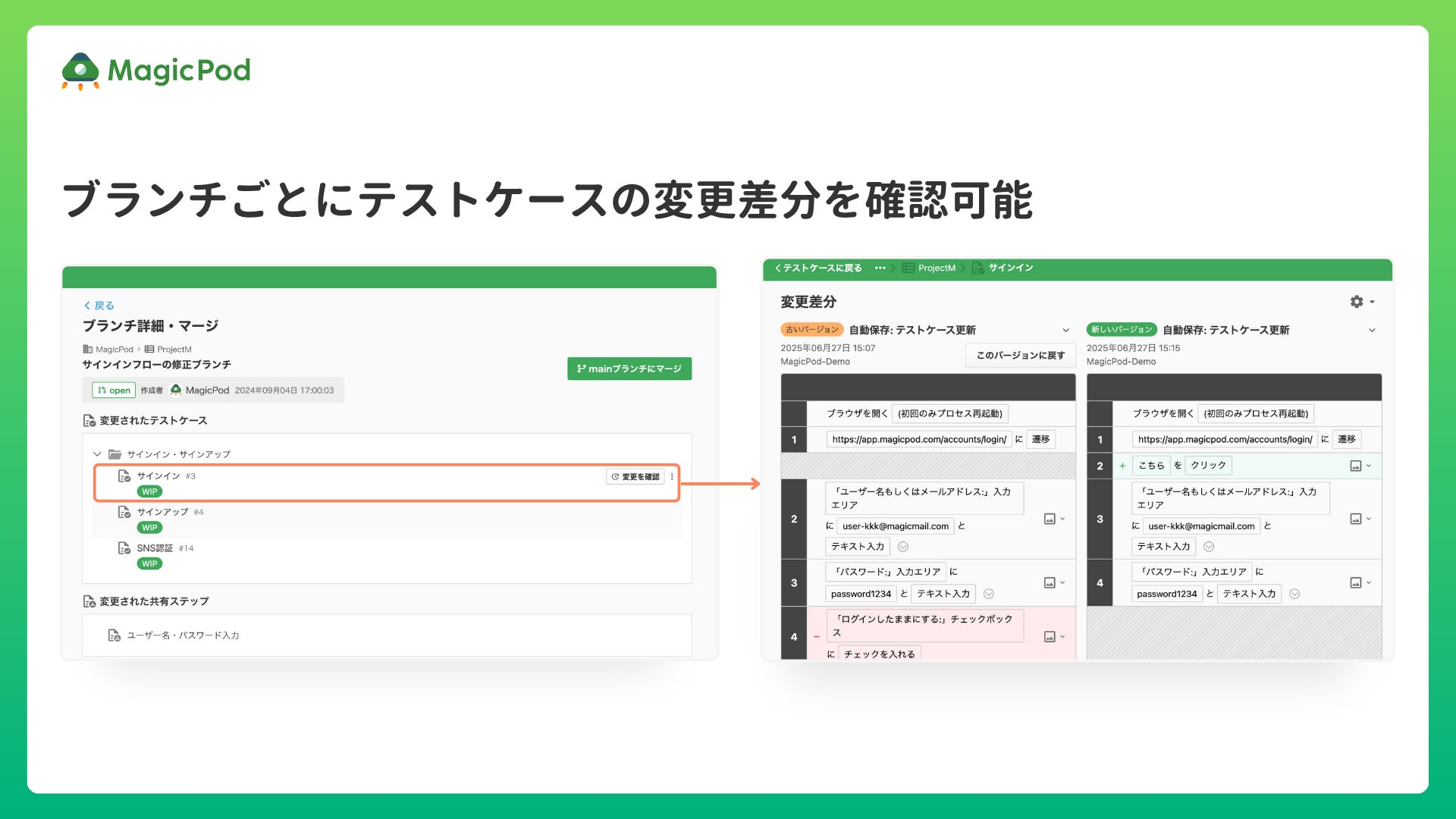 今回のブランチ機能の実装により、MagicPodはより実践的なチーム開発に対応できるテスト自動化ツールへと進化しました。個人によるテスト作成だけでなく、複数人での並行作業や、変更内容の差分レビュー、安全なマージ運用など、開発現場で求められるワークフローが実現できます。