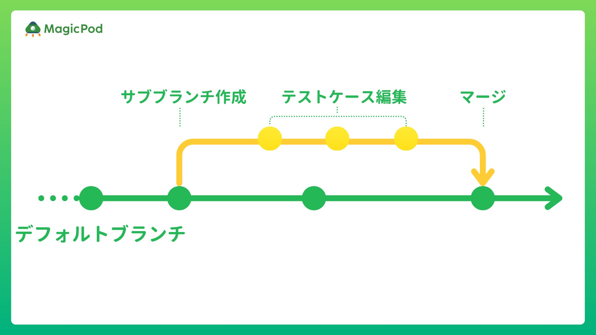 たとえば新しいUIやAPIが開発中の場合、その機能に対応したテストを本番テストに影響を与えずに作成・検証したい場面があります。ブランチ機能を使えば、専用の作業ブランチで自由にテストを編集・実行し、完成後にデフォルトブランチへマージすることで、段階的かつ安全なテスト運用が可能です。