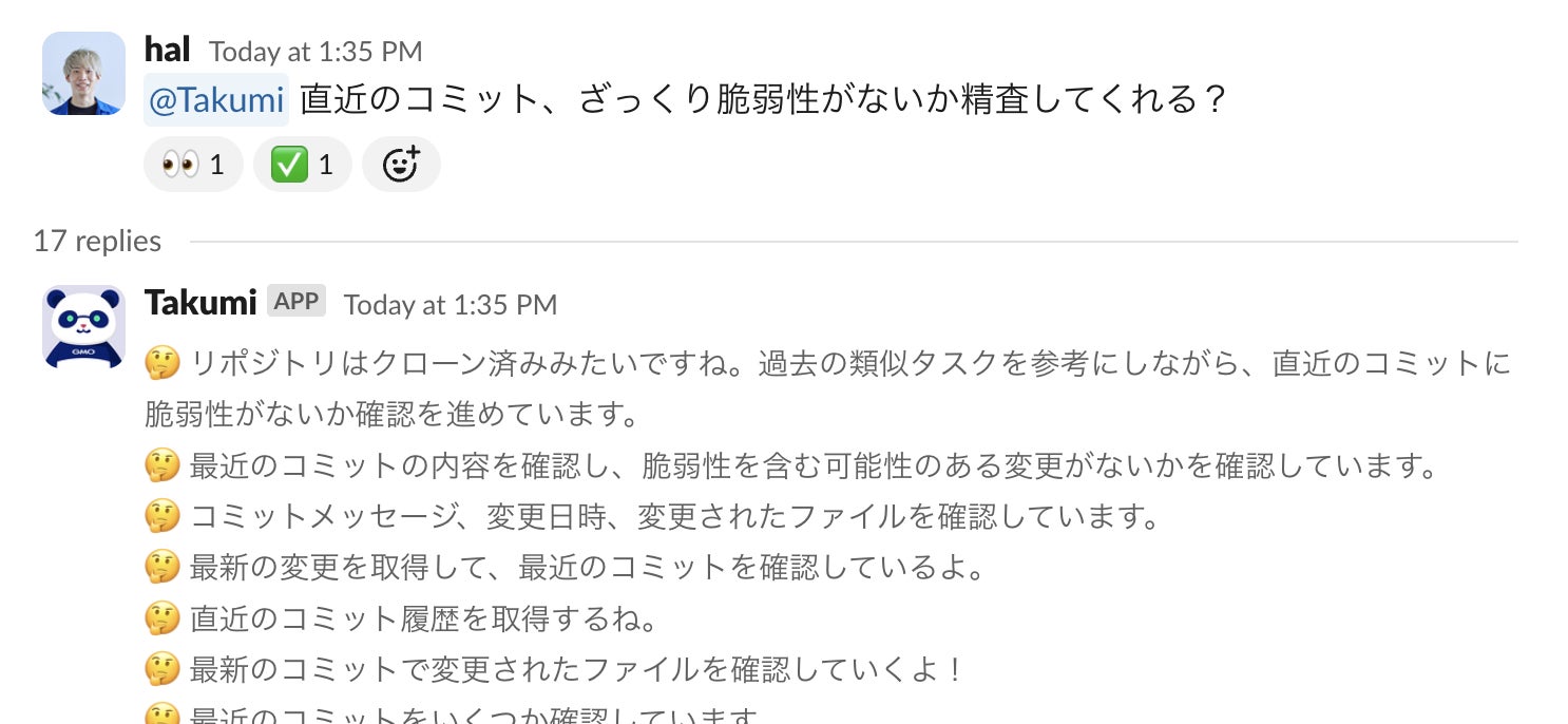 「Takumi」はGMO Flatt Securityが開発した、セキュリティ診断AIエージェントです。昨今世界中で爆発的に利用が増えているソフトウェア開発AIエージェントと異なる点は、「Takumi」は脆弱性診断をはじめとする開発中のセキュリティ業務に特化したAIエージェントである点です。 ユーザーは、「Takumi」をSlackワークスペースに追加すると、同僚のセキュリティエンジニアに仕事を依頼するように、ソフトウェア実装や設計のセキュリティレビュー等を依頼できます。その際、細かな問答は必要なく、数分から数十分の試行錯誤を自律的に実行します。