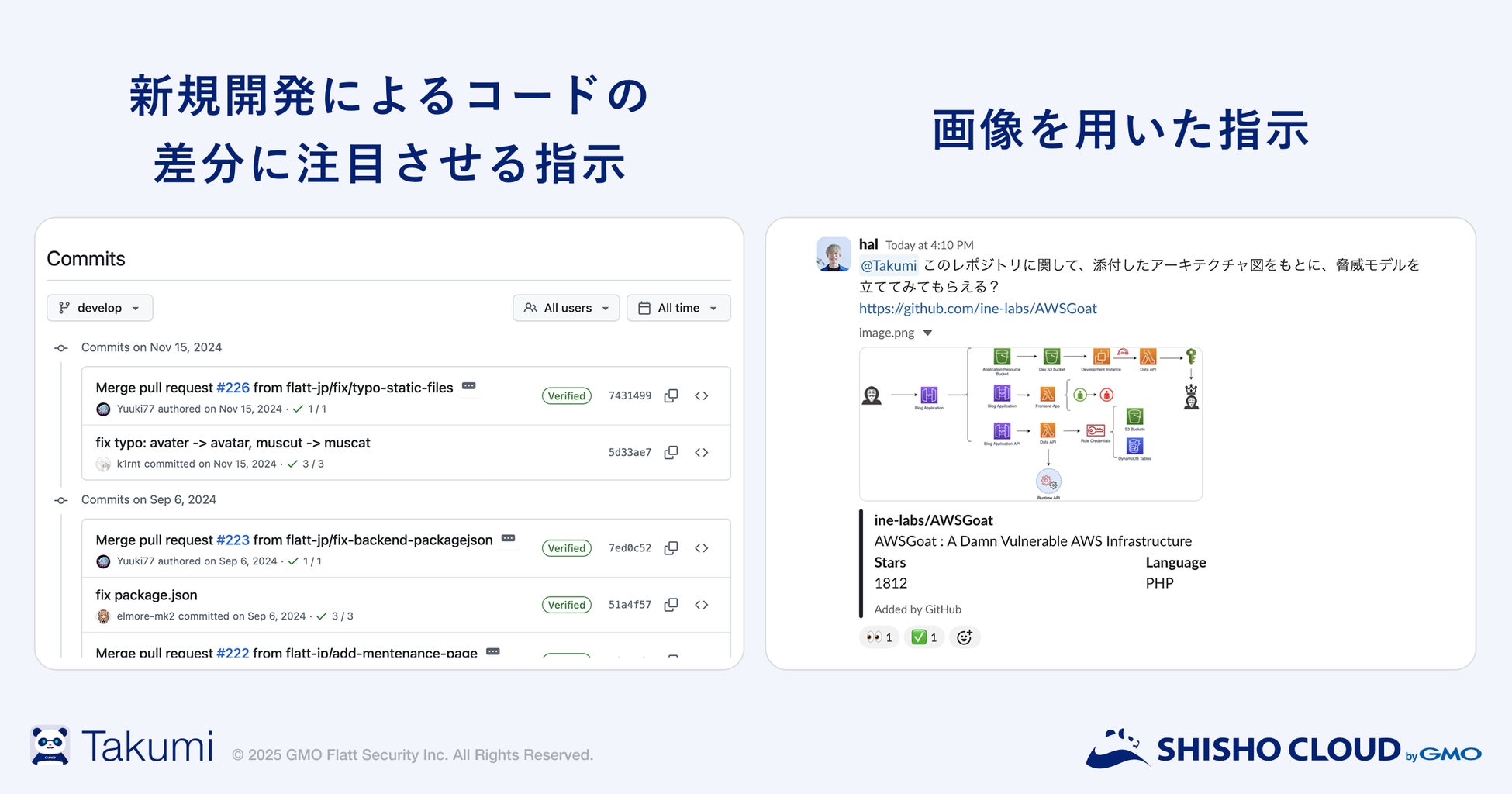 GitHubやShisho Cloud byGMO上で起きた変化など、各種イベントの内容を理解し、リスク判断を行います。判断の上でもしリスクがあればSlack上で報告します。「Takumi」に何かを依頼するまでもなく、継続的なリスク対処が可能です。