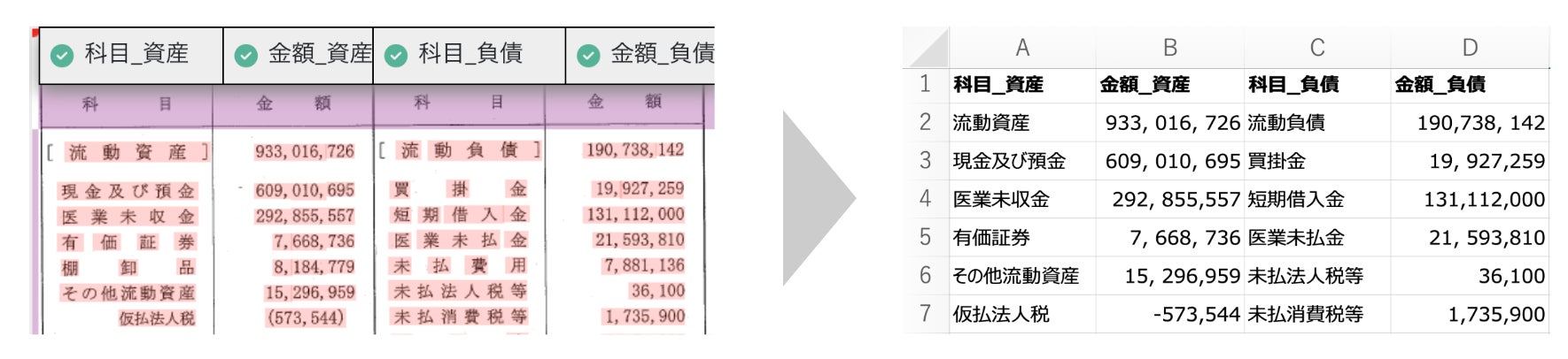 決算書などの複雑な構造の表を含んだ非定型文書を、事前に定義する必要なく、簡単に読み取り可能