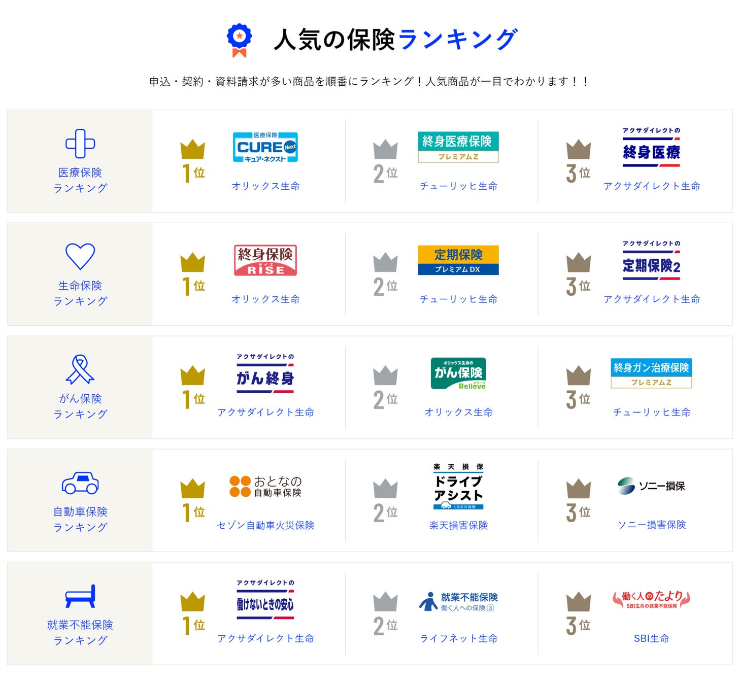 調査目的:各種保険の人気調査(契約数・資料請求数・閲覧数の多い順に作成)