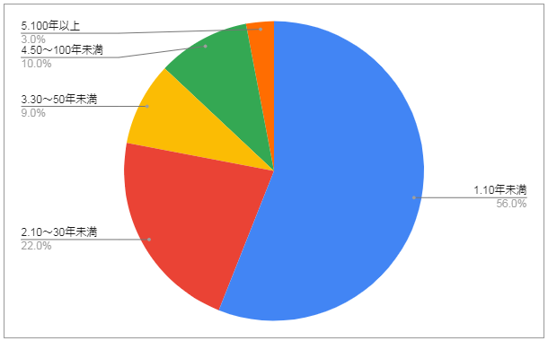 創業年数について聞いたところ、過半数の企業が10年未満となっています