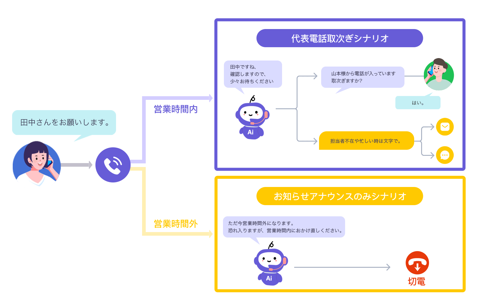 また、時間毎にシナリオを変更できるので、営業時間外のアナウンスとしてもご利用いただけます。