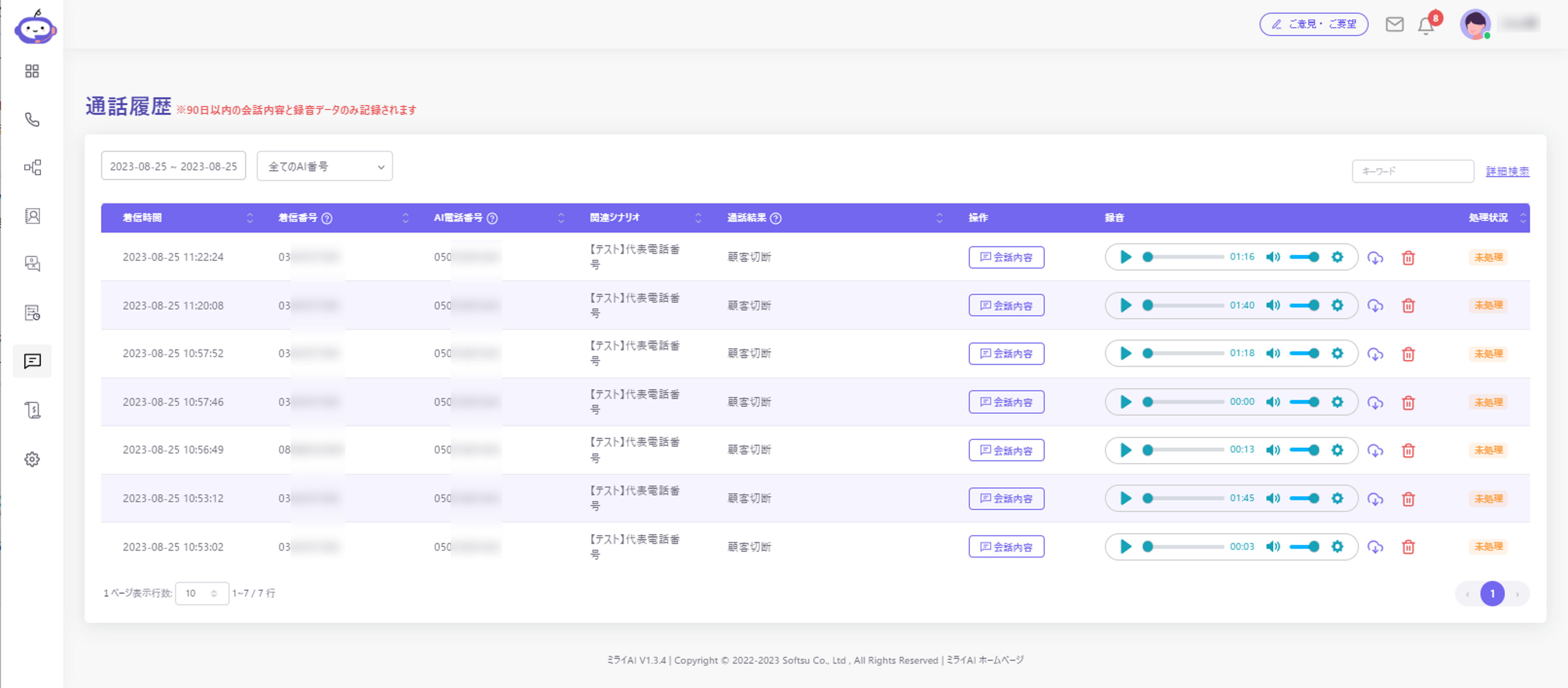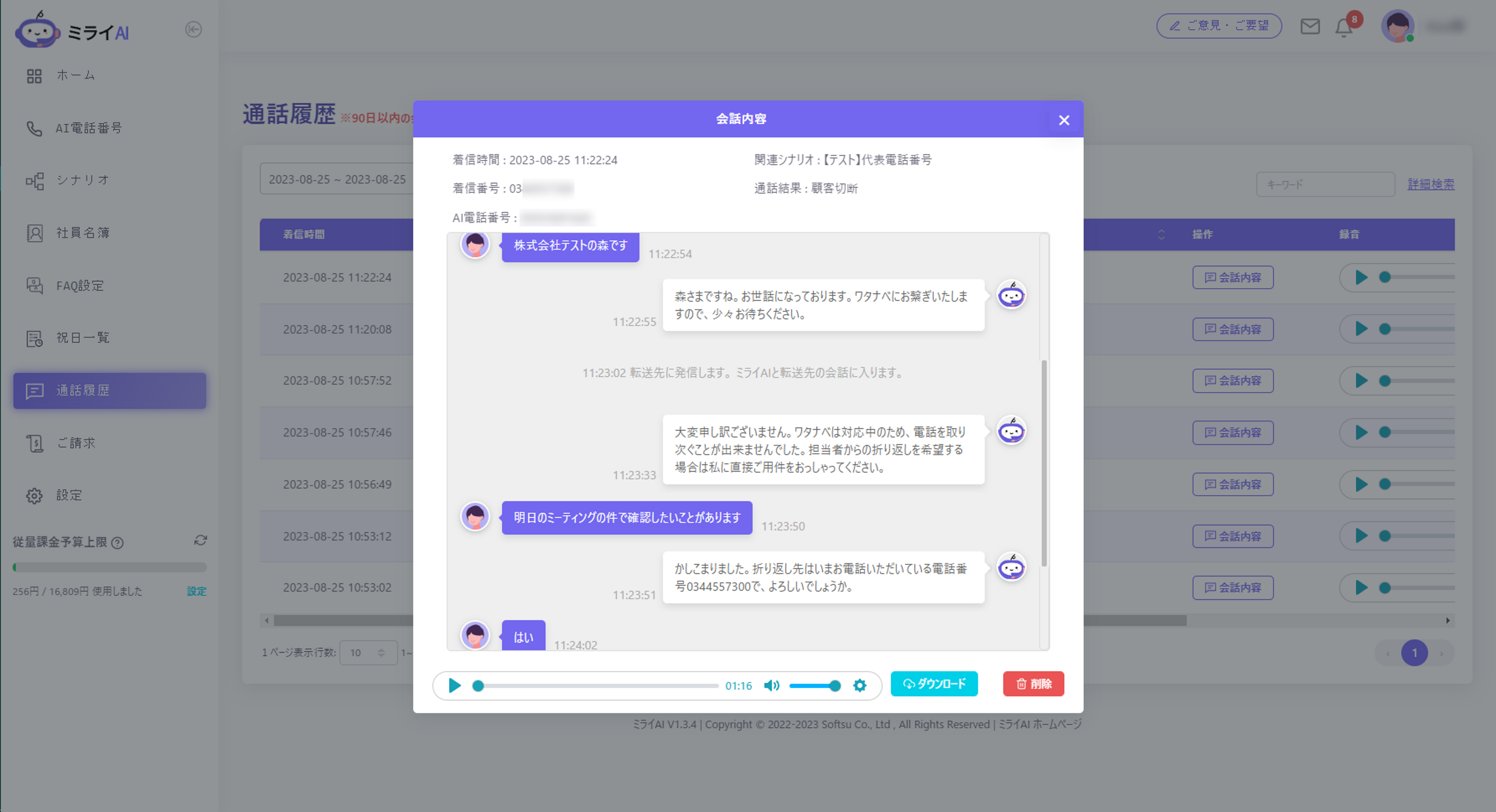 この機能により、ミライAIを通した自分宛ての発着信履歴一覧と会話内容がテキストで確認できるため、外出中や公休中の入電をわざわざ誰かに確認する必要が無く、効率的に折り返し対応ができます。