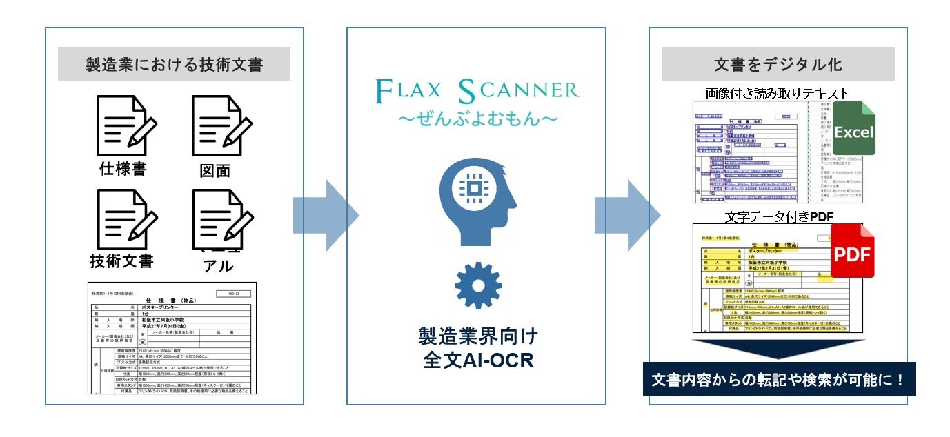 この度の最新AI-OCR「ぜんぶよむもん」は、書類内に記載されている文字をすべてテキストデータ化することで、文章の中身を含めた検索が可能です。検索対象が拡がることで、今まで時間がかかっていた資料の探索が、簡単にすばやくできるため、蓄積されたナレッジの効果的な活用が期待できます。そのほか、保管されている書類のペーパーレス化も実現します。
