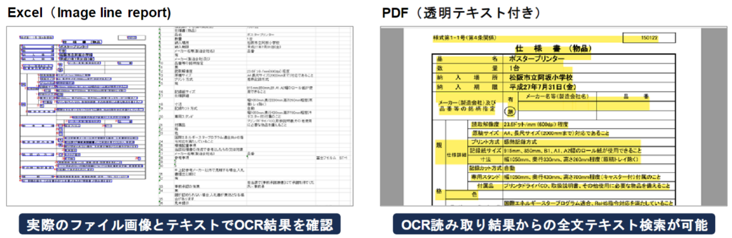 (*2) 透明テキストは、Searchable PDF(サーチャブルPDF)として元の画像ファイルの情報に載せてPDFファイルで出力されます。これにより、画像に加えてOCR読み取り結果からの全文テキスト検索などが可能となります。