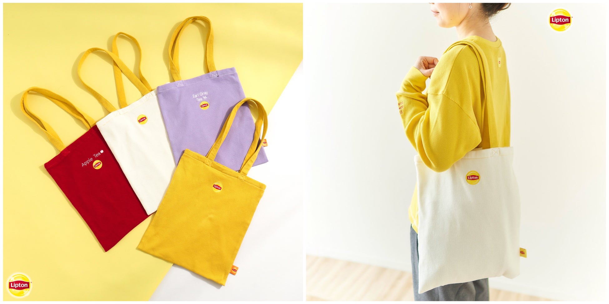 おなじみのLiptonロゴを刺繍で取り入れ、「レモンティー」や「ミルクティー」など人気フレーバーのイメージカラーに合わせたお洋服と雑貨を展開。