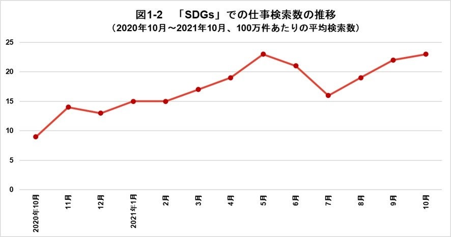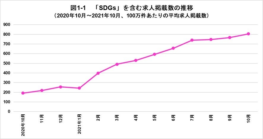 持続可能な開発目標(Sustainable Development Goals)を表す「SDGs」を含む求人掲載数は、社会での関心が高まる中で、仕事探しにおいても顕著な傾向が現れました。