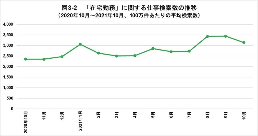 検索数は、求人掲載数ほどの上昇はありませんでしたが、それでもなお増加傾向は続いており、2021年10月は2020年同月の1.33倍でした(図3-2)。