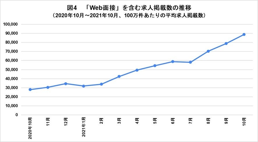 新型コロナウイルスの感染拡大が影響し、社員・アルバイトともに、採用面接もオンライン上で行われる機会が増えました。その結果、面接方法として「Web面接」と表記されている求人情報が増えています。「Web面接」を含む2021年10月の求人掲載数は、2020年同月の3.18倍となっており、採用プロセスにおいて、必要不可欠な方法になってきていることがわかります(図4)。