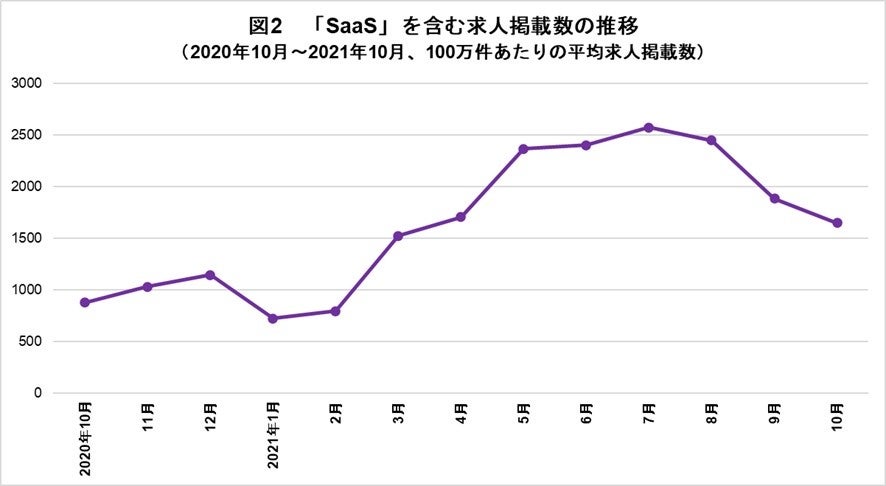 業務のDX化が進むにつれて、「SaaS」を含む求人情報も増え、2021年10月は2020年同月の1.89倍と2倍近くの増加となりました。特に春から夏にかけてより多く掲載されていました(図2)。