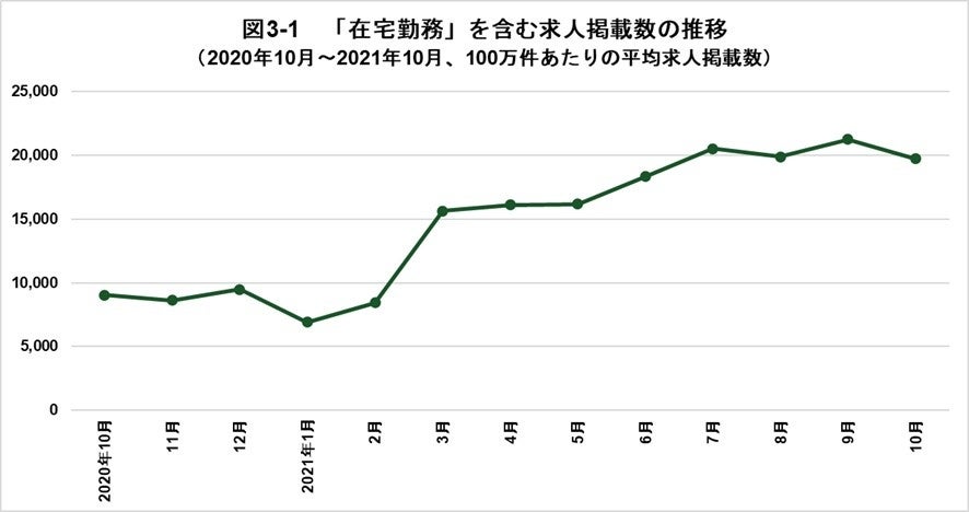 求人掲載数をみると、2021年10月は2020年同月の2.18倍でした。また、2021年1月から7月にかけては6ヶ月連続で前月を上回っています(図3-1)。