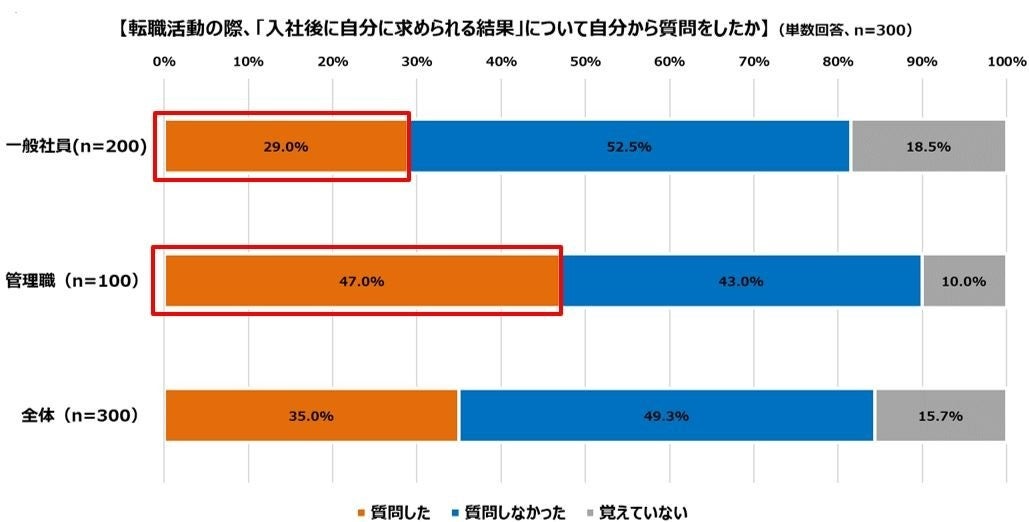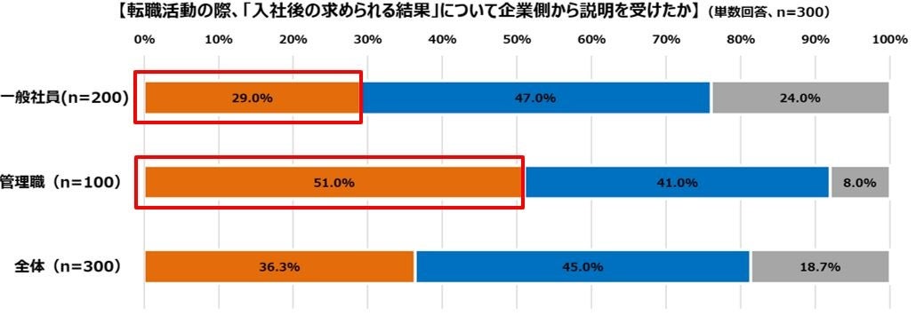 ・「入社後に自分に求められる結果」について、「企業側から説明を受けた」一般社員採用では29.0%、管理職(候補)採用は51.0%と差が。管理職(候補)は「求められる結果について自分から質問した」も47.0%と高い結果に。